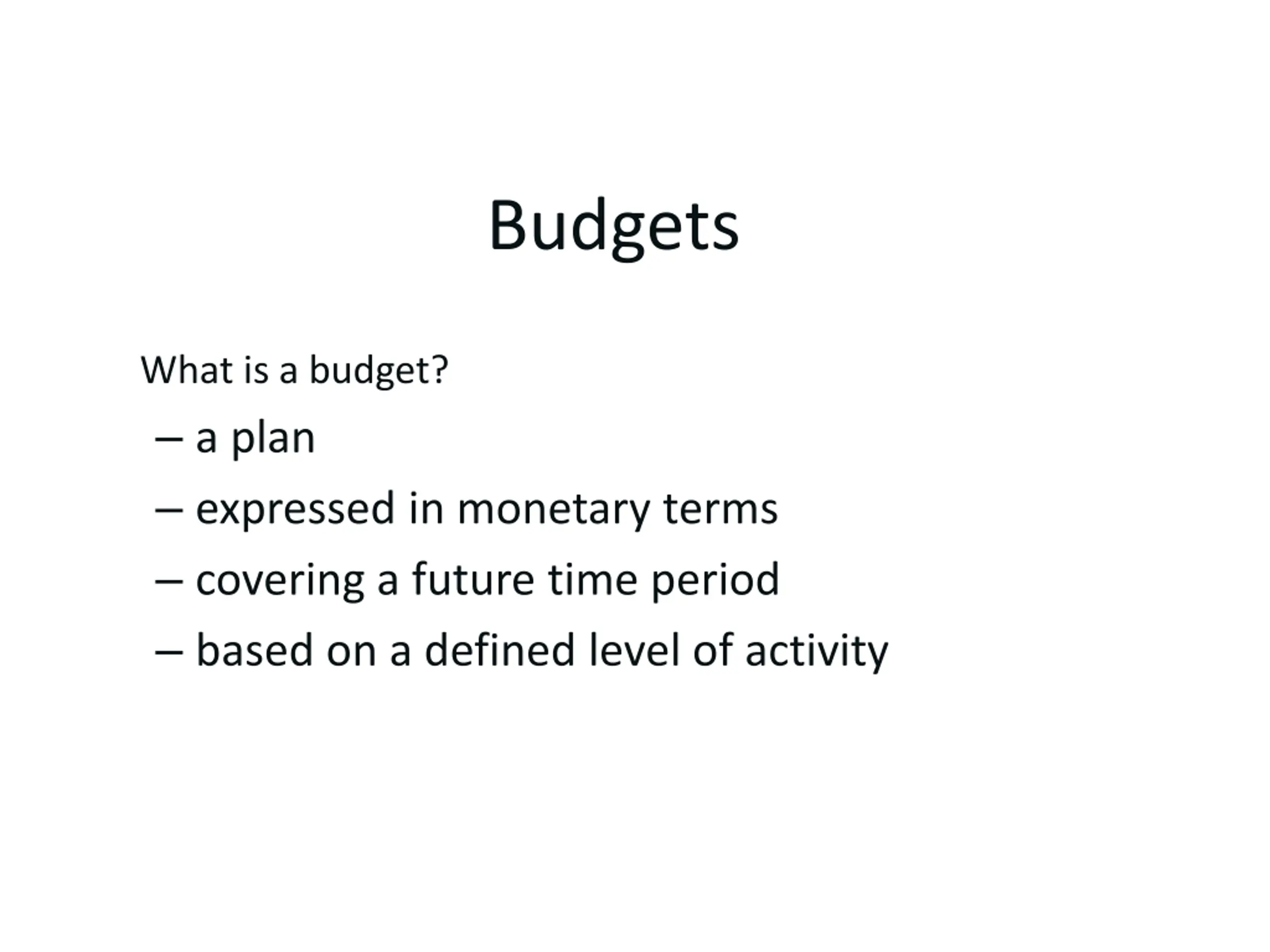 Budgets What is a budget? a plan expressed in monetary terms covering a future time period based on a defined level of activity