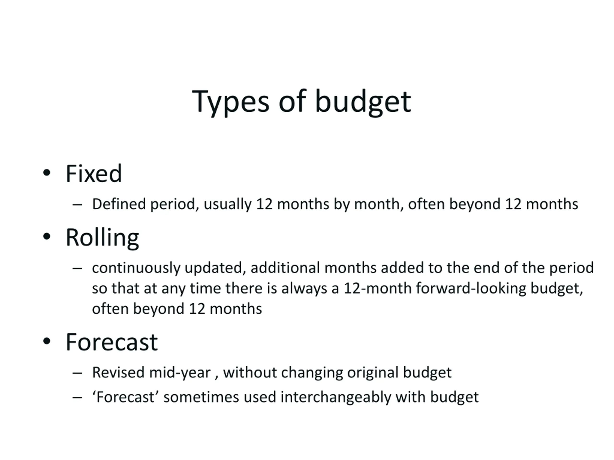 Types of budget Fixed Defined period, usually 12 months by month, often beyond 12 months Rolling continuously updated, additional months added to the end of the period so that at any time there is always a 12-month forward-looking budget, often beyond 12 months Forecast Revised mid-year , without changing original budget Forecast sometimes used interchangeably with budget