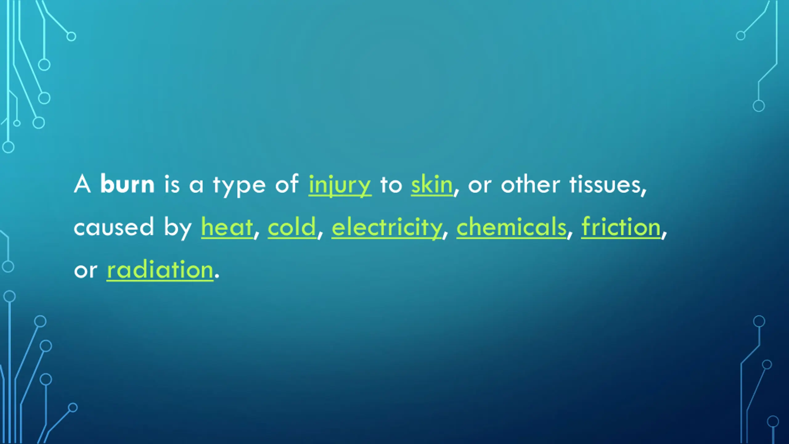 A burn is a type of injury to skin, or other tissues, caused by heat, cold, electricity, chemicals, friction, or radiation.