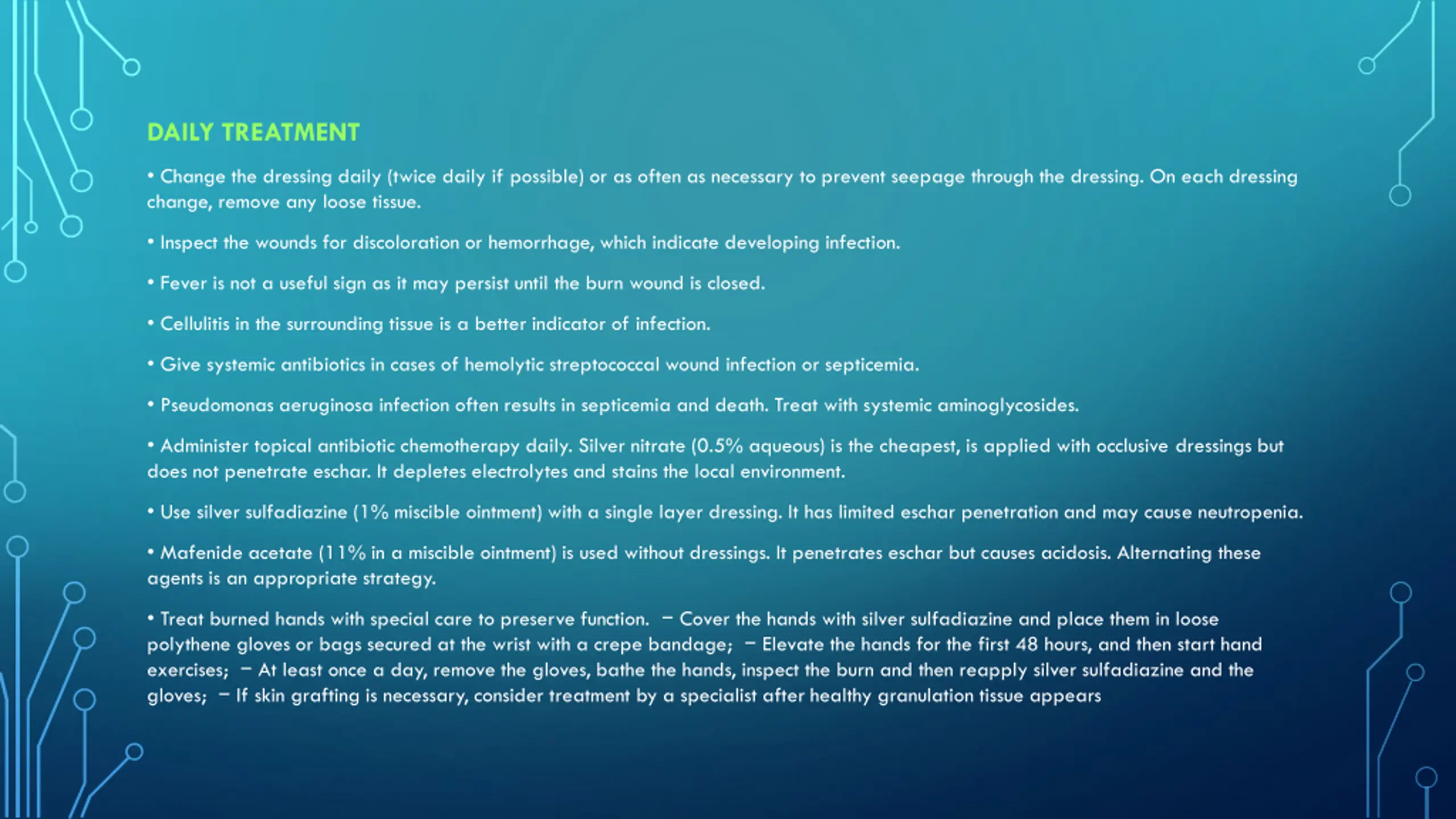 DAILY TREATMENT Change the dressing daily (twice daily if possible) or as often as necessary to prevent seepage through the dressing. On each dressing change, remove any loose tissue. Inspect the wounds for discoloration or hemorrhage, which indicate developing infection. Fever is not a useful sign as it may persist until the burn wound is closed. Cellulitis in the surrounding tissue is a better indicator of infection. Give systemic antibiotics in cases of hemolytic streptococcal wound infection or septicemia. Pseudomonas aeruginosa infection often results in septicemia and death. Treat with systemic aminoglycosides. Administer topical antibiotic chemotherapy daily. Silver nitrate (0.5% aqueous) is the cheapest, is applied with occlusive dressings but does not penetrate eschar. It depletes electrolytes and stains the local environment. Use silver sulfadiazine (1% miscible ointment) with a single layer dressing. It has limited eschar penetration and may cause neutropenia. Mafenide acetate (11% in a miscible ointment) is used without dressings. It penetrates eschar but causes acidosis. Alternating these agents is an appropriate strategy. Treat burned hands with special care to preserve function. Cover the hands with silver sulfadiazine and place them in loose polythene gloves or bags secured at the wrist with a crepe bandage; Elevate the hands for the first 48 hours, and then start hand exercises; At least once a day, remove the gloves, bathe the hands, inspect the burn and then reapply silver sulfadiazine and the gloves; If skin grafting is necessary, consider treatment by a specialist after healthy granulation tissue appears