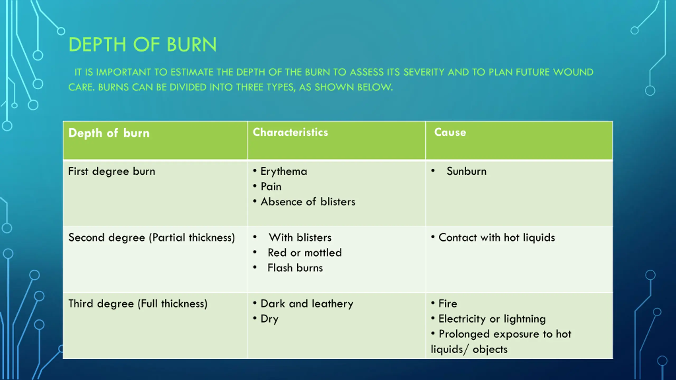 DEPTH OF BURN IT IS IMPORTANT TO ESTIMATE THE DEPTH OF THE BURN TO ASSESS ITS SEVERITY AND TO PLAN FUTURE WOUND CARE. BURNS CAN BE DIVIDED INTO THREE TYPES, AS SHOWN BELOW. Characteristics Cause Depth of burn First degree burn Erythema Pain Absence of blisters Sunburn Red or mottled Flash burns Second degree (Partial thickness) With blisters Contact with hot liquids Third degree (Full thickness) Dark and leathery Dry Fire Electricity or lightning Prolonged exposure to hot liquids/ objects