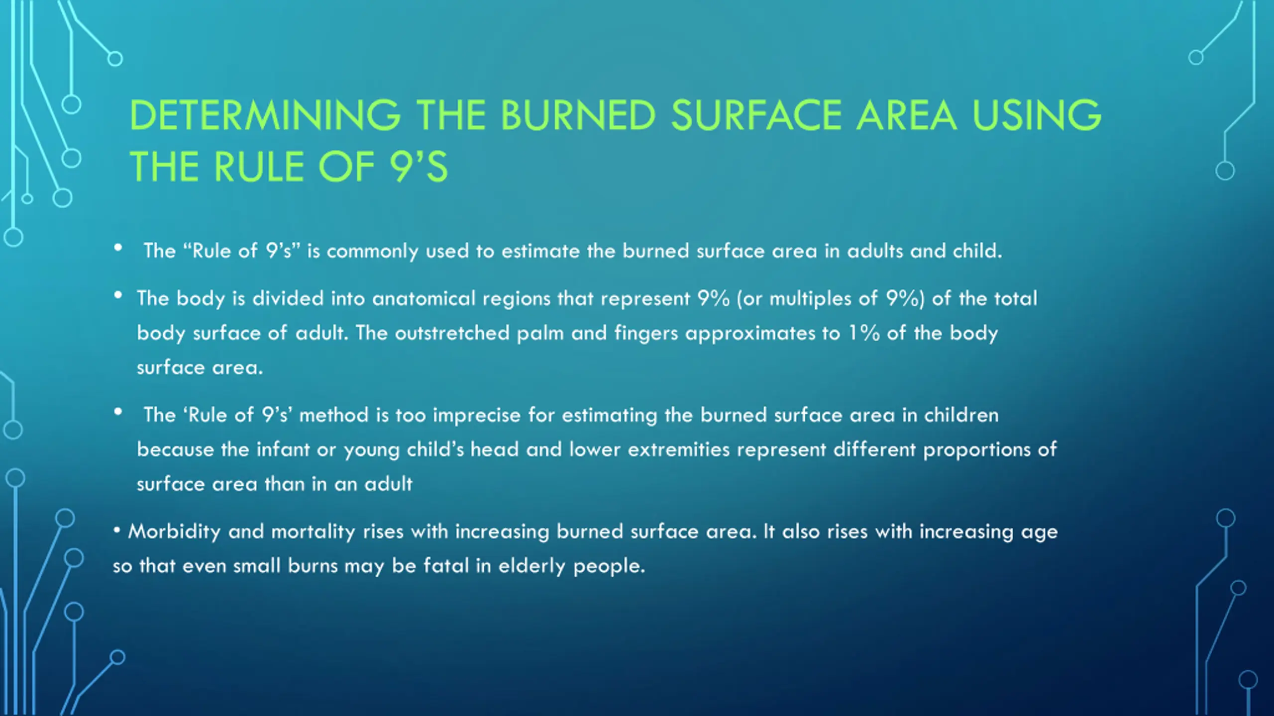 DETERMINING THE BURNED SURFACE AREA USING THE RULE OF 9 S The Rule of 9 s is commonly used to estimate the burned surface area in adults and child. The body is divided into anatomical regions that represent 9% (or multiples of 9%) of the total body surface of adult. The outstretched palm and fingers approximates to 1% of the body surface area. The Rule of 9 s method is too imprecise for estimating the burned surface area in children because the infant or young child s head and lower extremities represent different proportions of surface area than in an adult Morbidity and mortality rises with increasing burned surface area. It also rises with increasing age so that even small burns may be fatal in elderly people.