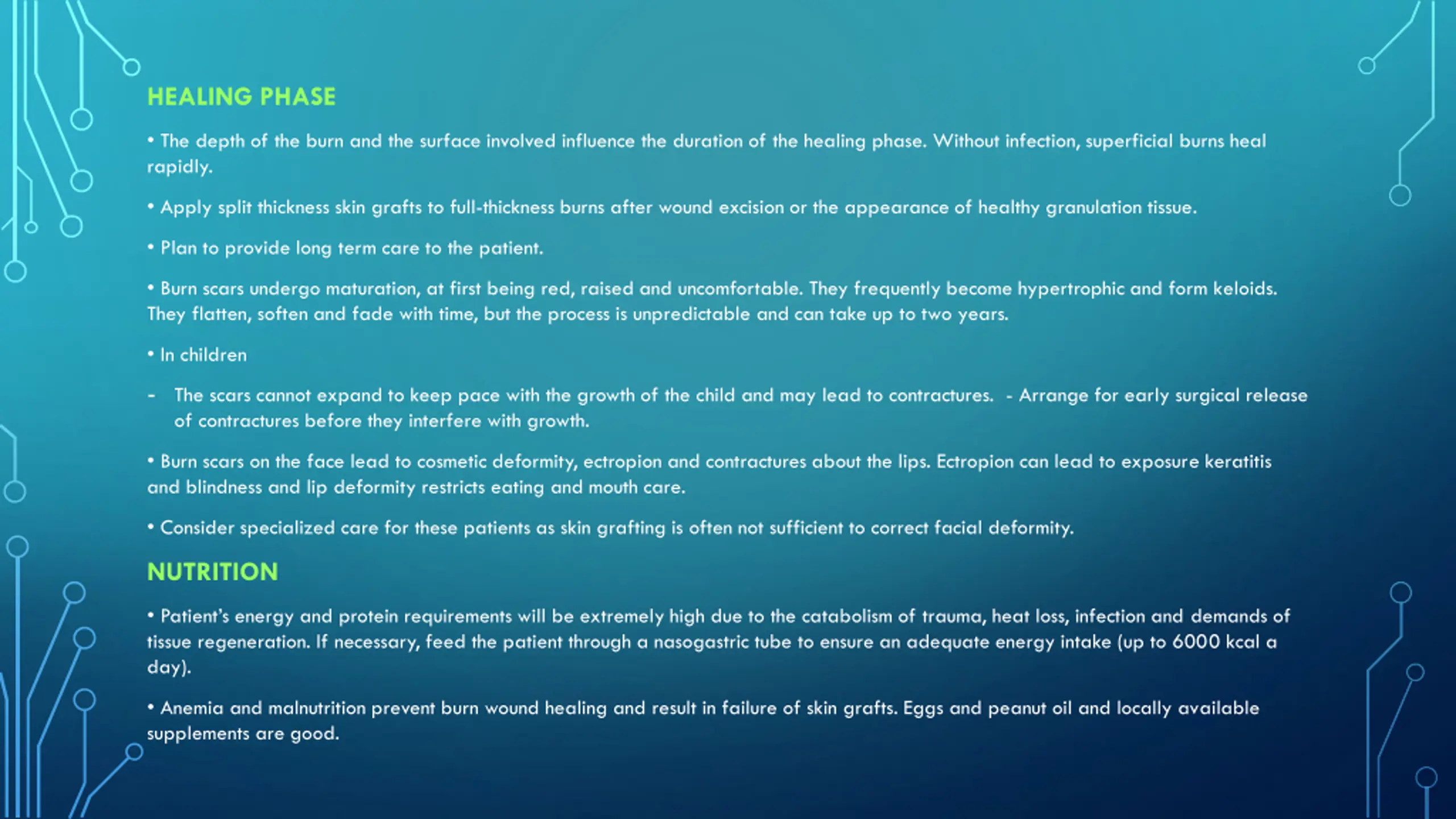 HEALING PHASE The depth of the burn and the surface involved influence the duration of the healing phase. Without infection, superficial burns heal rapidly. Apply split thickness skin grafts to full-thickness burns after wound excision or the appearance of healthy granulation tissue. Plan to provide long term care to the patient. Burn scars undergo maturation, at first being red, raised and uncomfortable. They frequently become hypertrophic and form keloids. They flatten, soften and fade with time, but the process is unpredictable and can take up to two years. In children - The scars cannot expand to keep pace with the growth of the child and may lead to contractures. - Arrange for early surgical release of contractures before they interfere with growth. Burn scars on the face lead to cosmetic deformity, ectropion and contractures about the lips. Ectropion can lead to exposure keratitis and blindness and lip deformity restricts eating and mouth care. Consider specialized care for these patients as skin grafting is often not sufficient to correct facial deformity. NUTRITION Patient s energy and protein requirements will be extremely high due to the catabolism of trauma, heat loss, infection and demands of tissue regeneration. If necessary, feed the patient through a nasogastric tube to ensure an adequate energy intake (up to 6000 kcal a day). Anemia and malnutrition prevent burn wound healing and result in failure of skin grafts. Eggs and peanut oil and locally available supplements are good.
