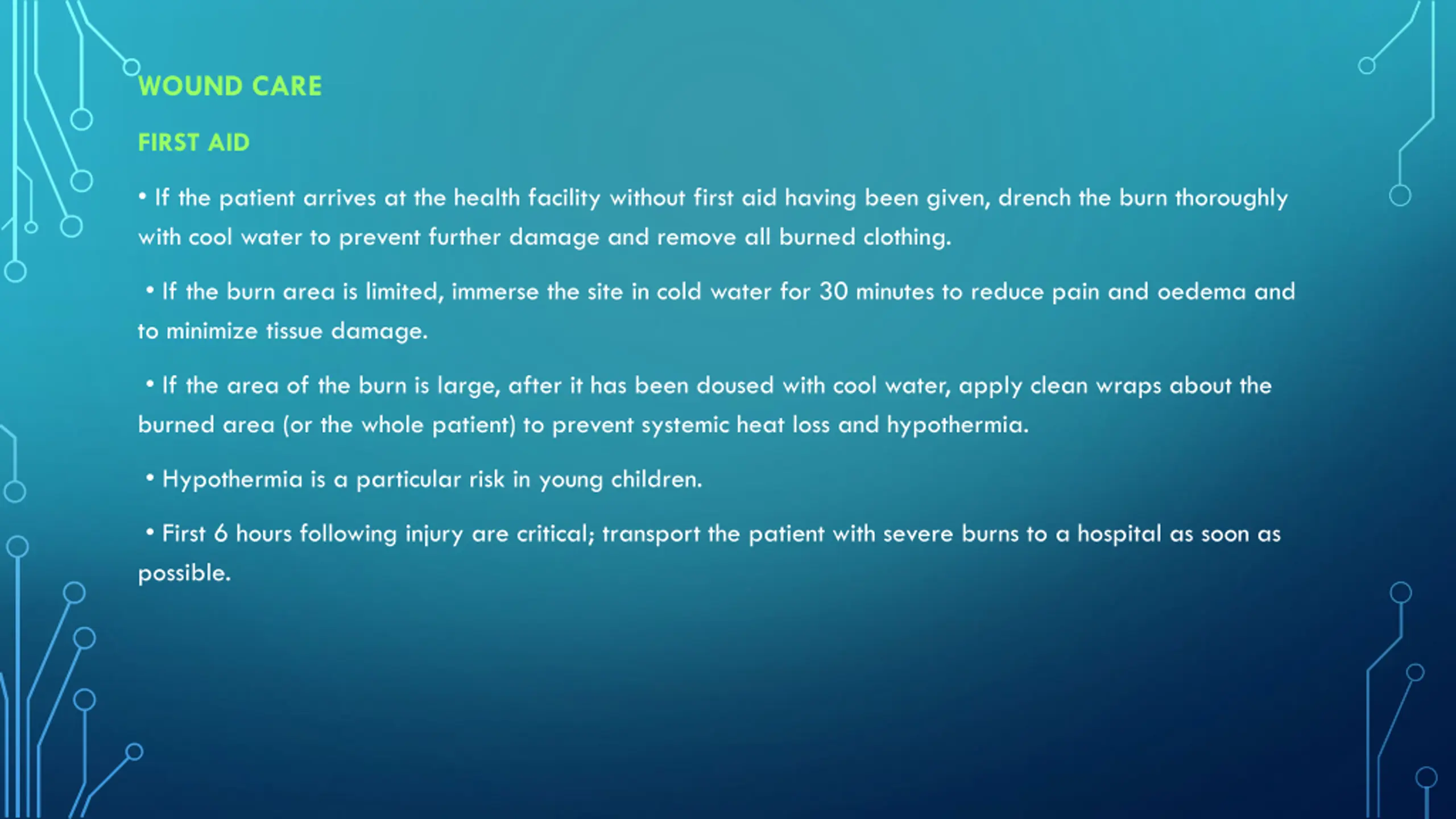 WOUND CARE FIRST AID If the patient arrives at the health facility without first aid having been given, drench the burn thoroughly with cool water to prevent further damage and remove all burned clothing. If the burn area is limited, immerse the site in cold water for 30 minutes to reduce pain and oedema and to minimize tissue damage. If the area of the burn is large, after it has been doused with cool water, apply clean wraps about the burned area (or the whole patient) to prevent systemic heat loss and hypothermia. Hypothermia is a particular risk in young children. First 6 hours following injury are critical; transport the patient with severe burns to a hospital as soon as possible.