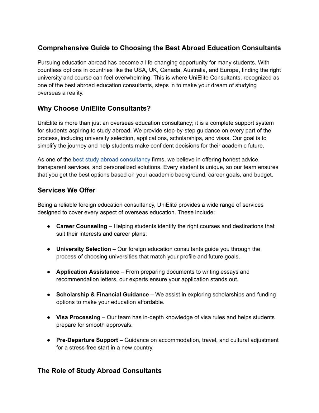 Comprehensive Guide to Choosing the Best Abroad Education Consultants Pursuing education abroad has become a life-changing opportunity for many students. With countless options in countries like the USA, UK, Canada, Australia, and Europe, finding the right university and course can feel overwhelming. This is where UniElite Consultants, recognized as one of the best abroad education consultants, steps in to make your dream of studying overseas a reality. Why Choose UniElite Consultants? UniElite is more than just an overseas education consultancy; it is a complete support system for students aspiring to study abroad. We provide step-by-step guidance on every part of the process, including university selection, applications, scholarships, and visas. Our goal is to simplify the journey and help students make confident decisions for their academic future. As one of the best study abroad consultancy firms, we believe in offering honest advice, transparent services, and personalized solutions. Every student is unique, so our team ensures that you get the best options based on your academic background, career goals, and budget. Services We Offer Being a reliable foreign education consultancy, UniElite provides a wide range of services designed to cover every aspect of overseas education. These include: Career Counseling Helping students identify the right courses and destinations that suit their interests and career plans. University Selection Our foreign education consultants guide you through the process of choosing universities that match your profile and future goals. Application Assistance From preparing documents to writing essays and recommendation letters, our experts ensure your application stands out. Scholarship & Financial Guidance We assist in exploring scholarships and funding options to make your education affordable. Visa Processing Our team has in-depth knowledge of visa rules and helps students prepare for smooth approvals. Pre-Departure Support Guidance on accommodation, travel, and cultural adjustment for a stress-free start in a new country. The Role of Study Abroad Consultants