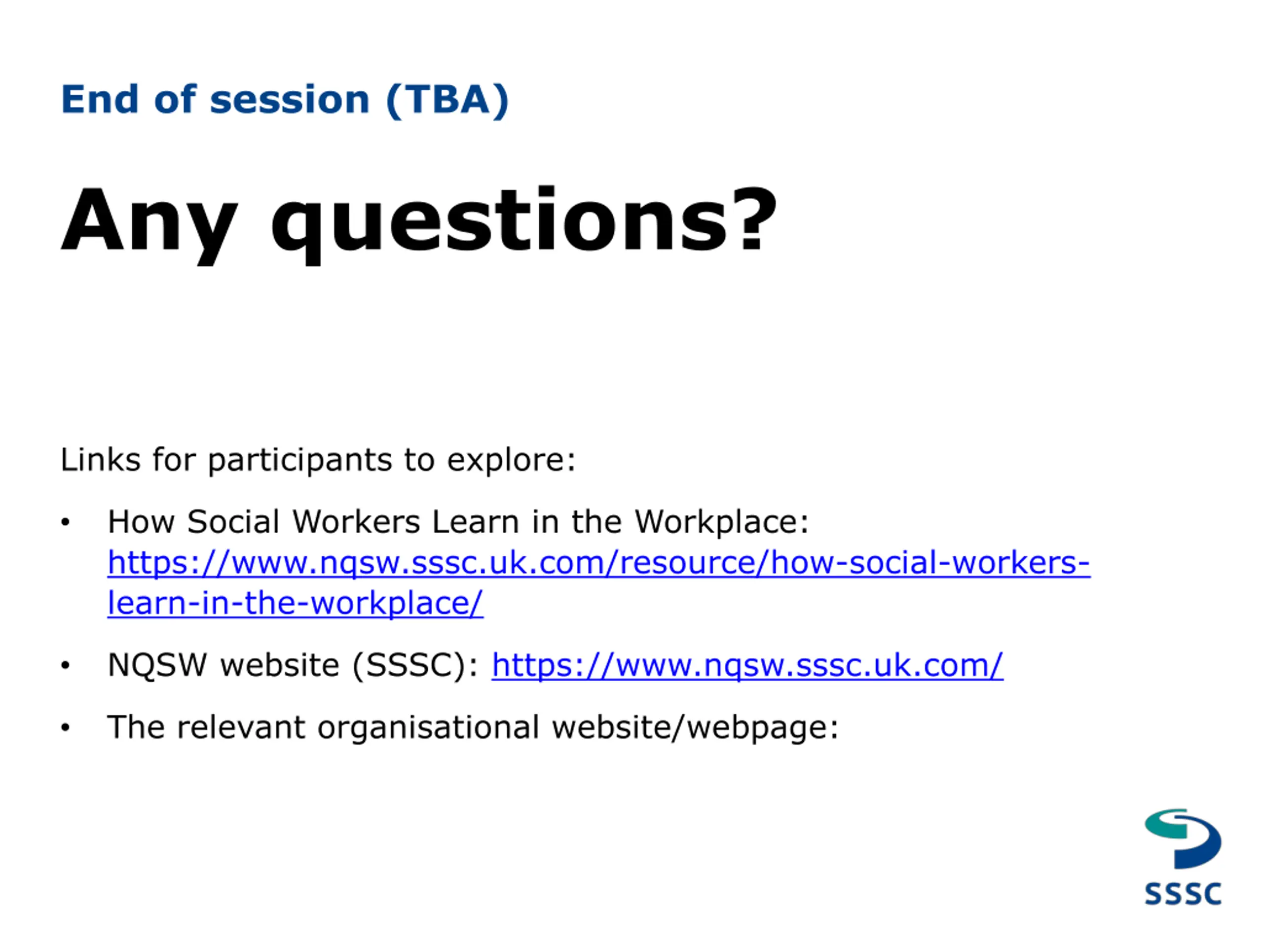 End of session (TBA) Any questions? Links for participants to explore: How Social Workers Learn in the Workplace: https://www.nqsw.sssc.uk.com/resource/how-social-workers- learn-in-the-workplace/ NQSW website (SSSC): https://www.nqsw.sssc.uk.com/ The relevant organisational website/webpage: