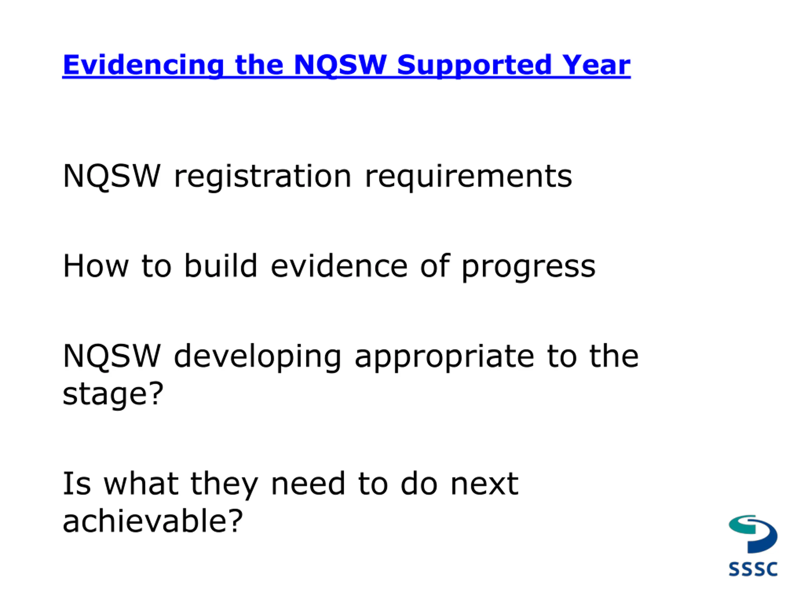 Evidencing the NQSW Supported Year NQSW registration requirements How to build evidence of progress NQSW developing appropriate to the stage? Is what they need to do next achievable?