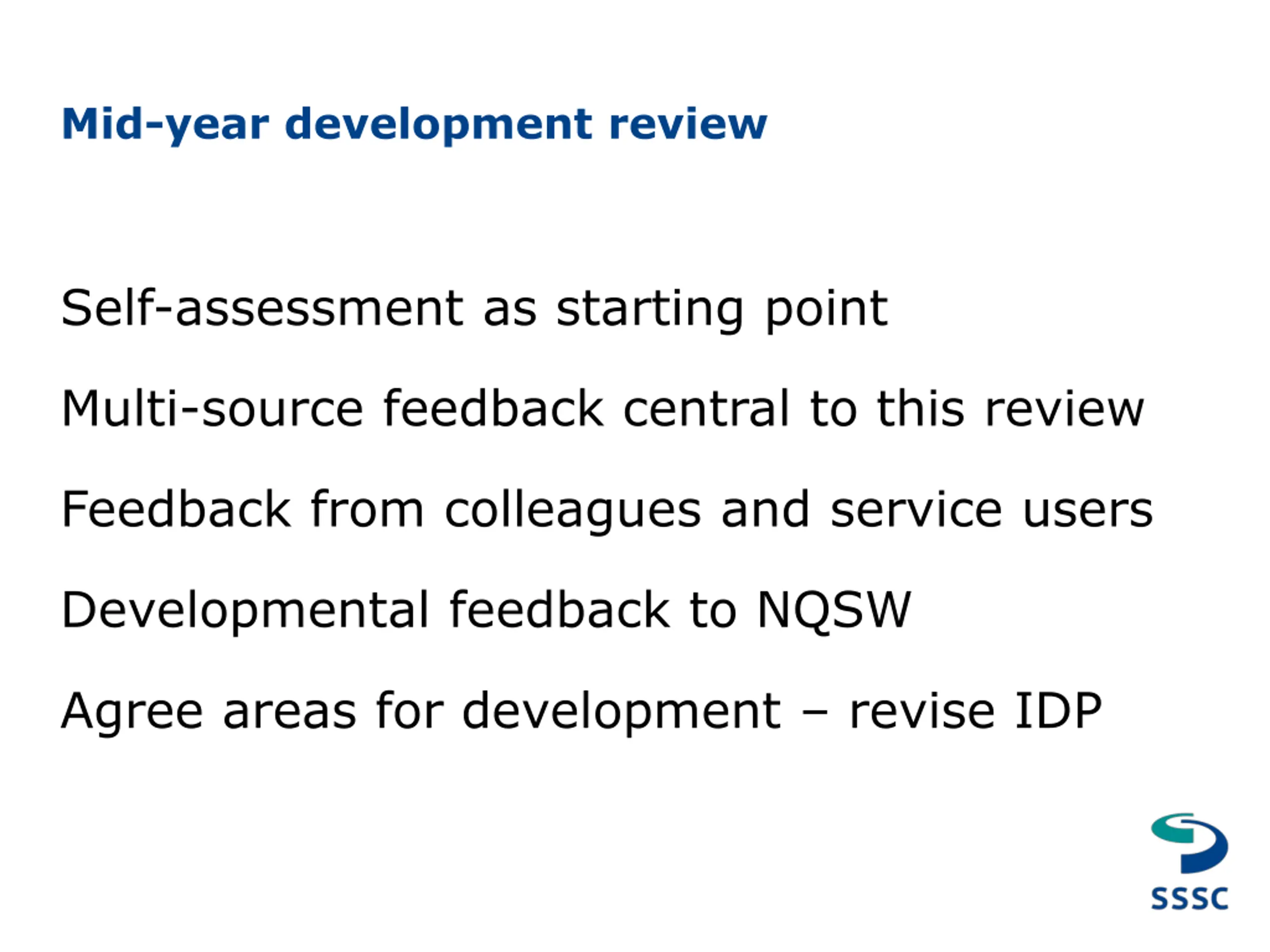 Mid-year development review Self-assessment as starting point Multi-source feedback central to this review Feedback from colleagues and service users Developmental feedback to NQSW Agree areas for development revise IDP