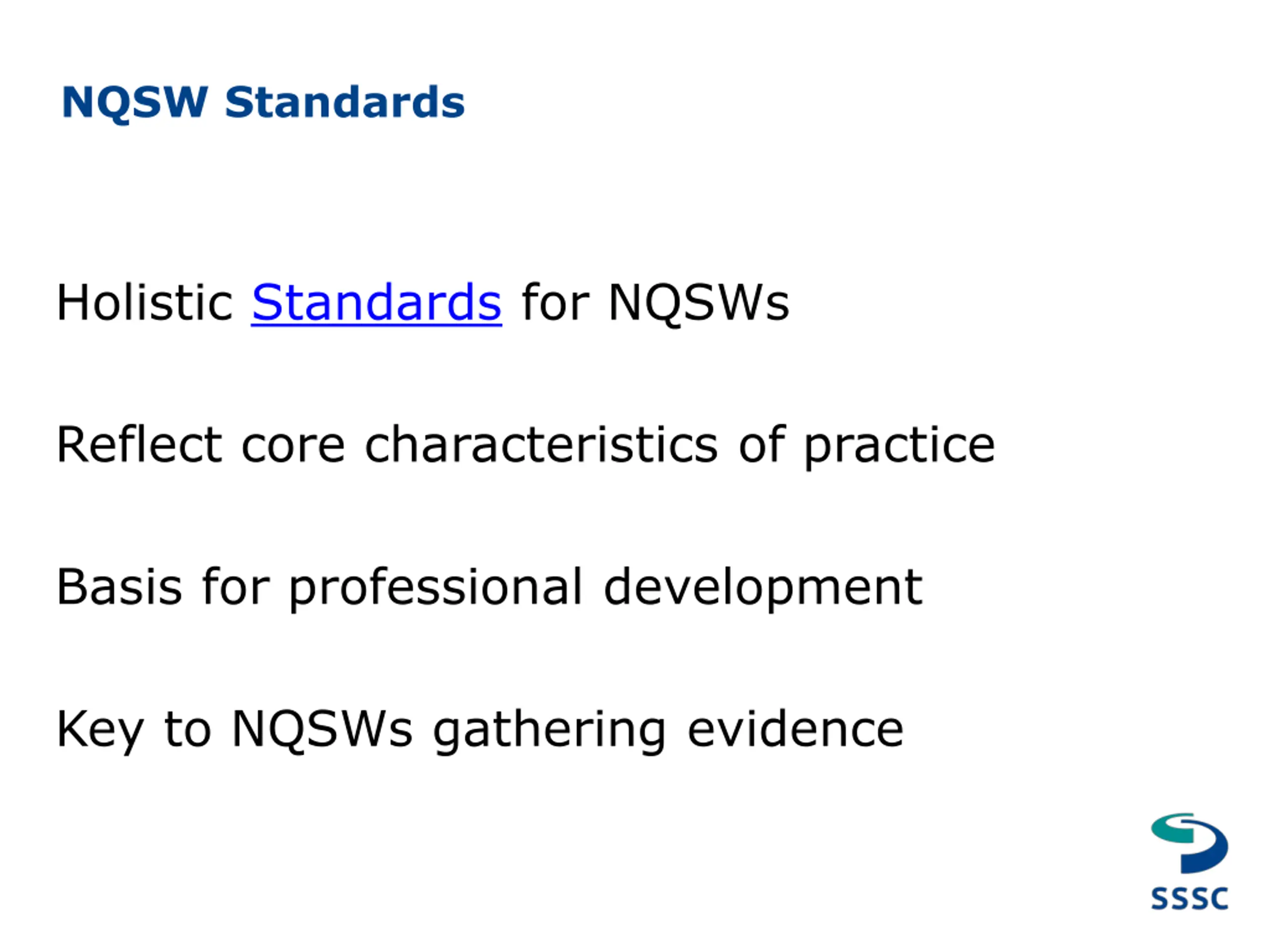 NQSW Standards Holistic Standards for NQSWs Reflect core characteristics of practice Basis for professional development Key to NQSWs gathering evidence