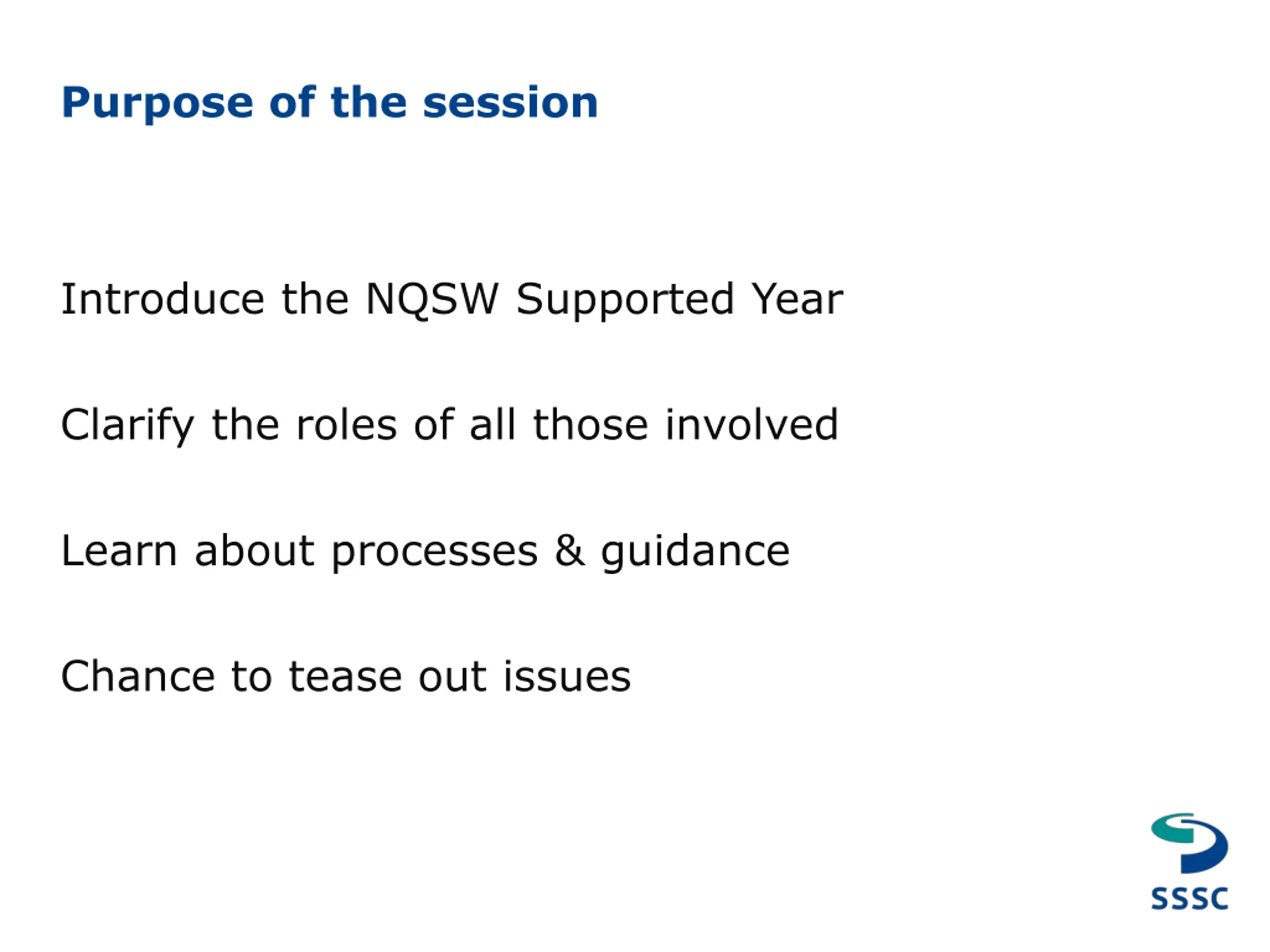 Purpose of the session Introduce the NQSW Supported Year Clarify the roles of all those involved Learn about processes & guidance Chance to tease out issues