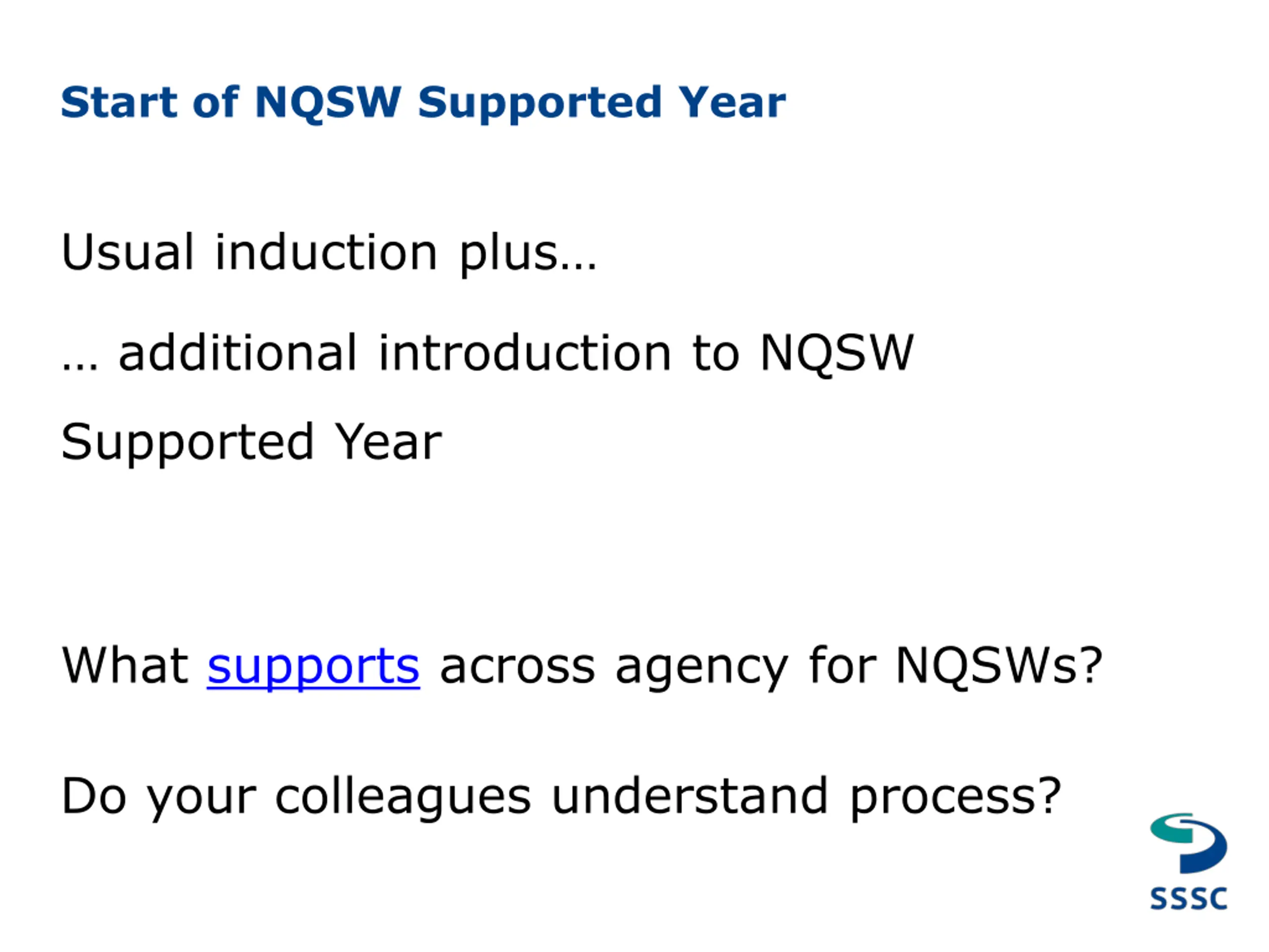 Start of NQSW Supported Year Usual induction plus additional introduction to NQSW Supported Year What supports across agency for NQSWs? Do your colleagues understand process?