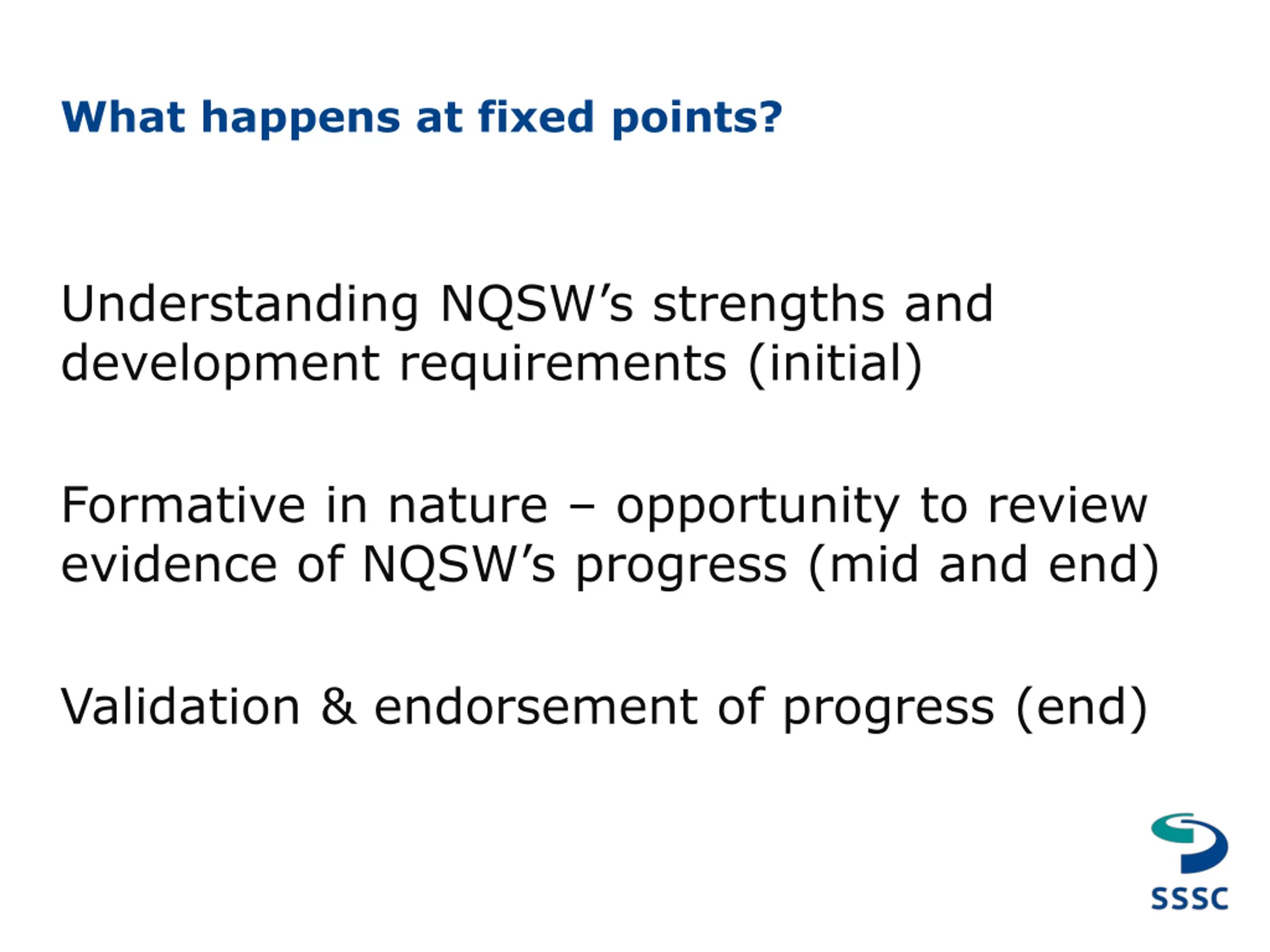 What happens at fixed points? Understanding NQSW s strengths and development requirements (initial) Formative in nature opportunity to review evidence of NQSW s progress (mid and end) Validation & endorsement of progress (end)