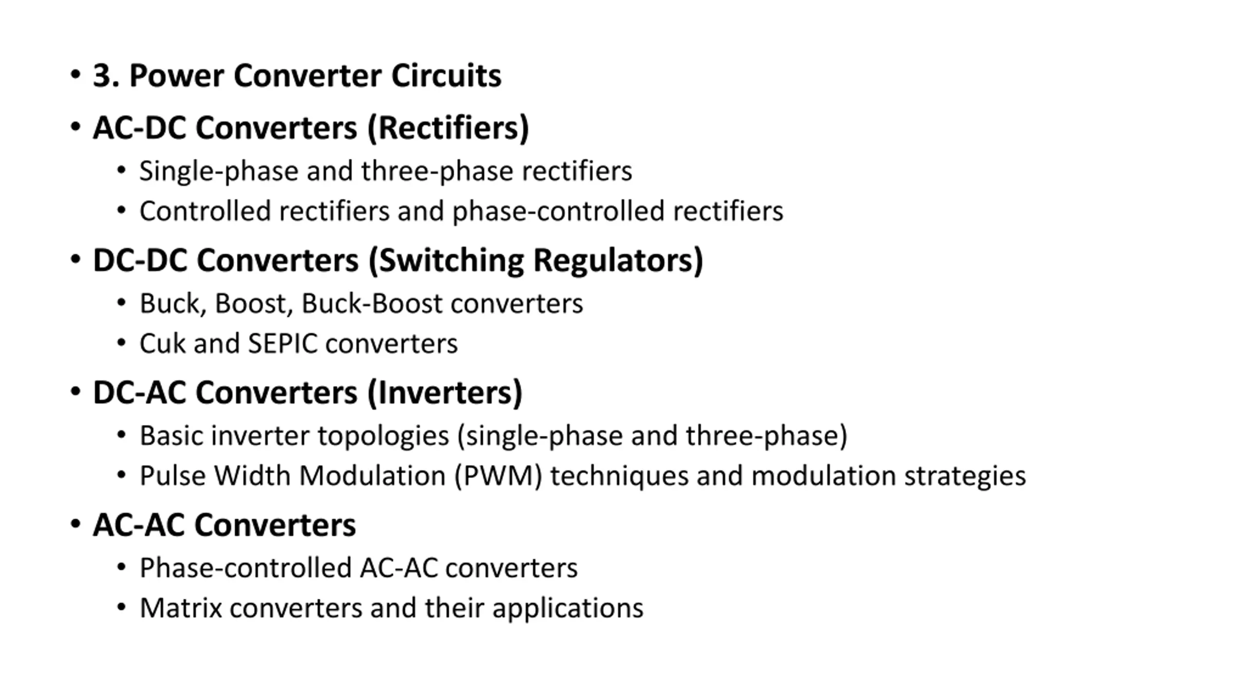 3. Power Converter Circuits AC-DC Converters (Rectifiers) Single-phase and three-phase rectifiers Controlled rectifiers and phase-controlled rectifiers DC-DC Converters (Switching Regulators) Buck, Boost, Buck-Boost converters Cuk and SEPIC converters DC-AC Converters (Inverters) Basic inverter topologies (single-phase and three-phase) Pulse Width Modulation (PWM) techniques and modulation strategies AC-AC Converters Phase-controlled AC-AC converters Matrix converters and their applications