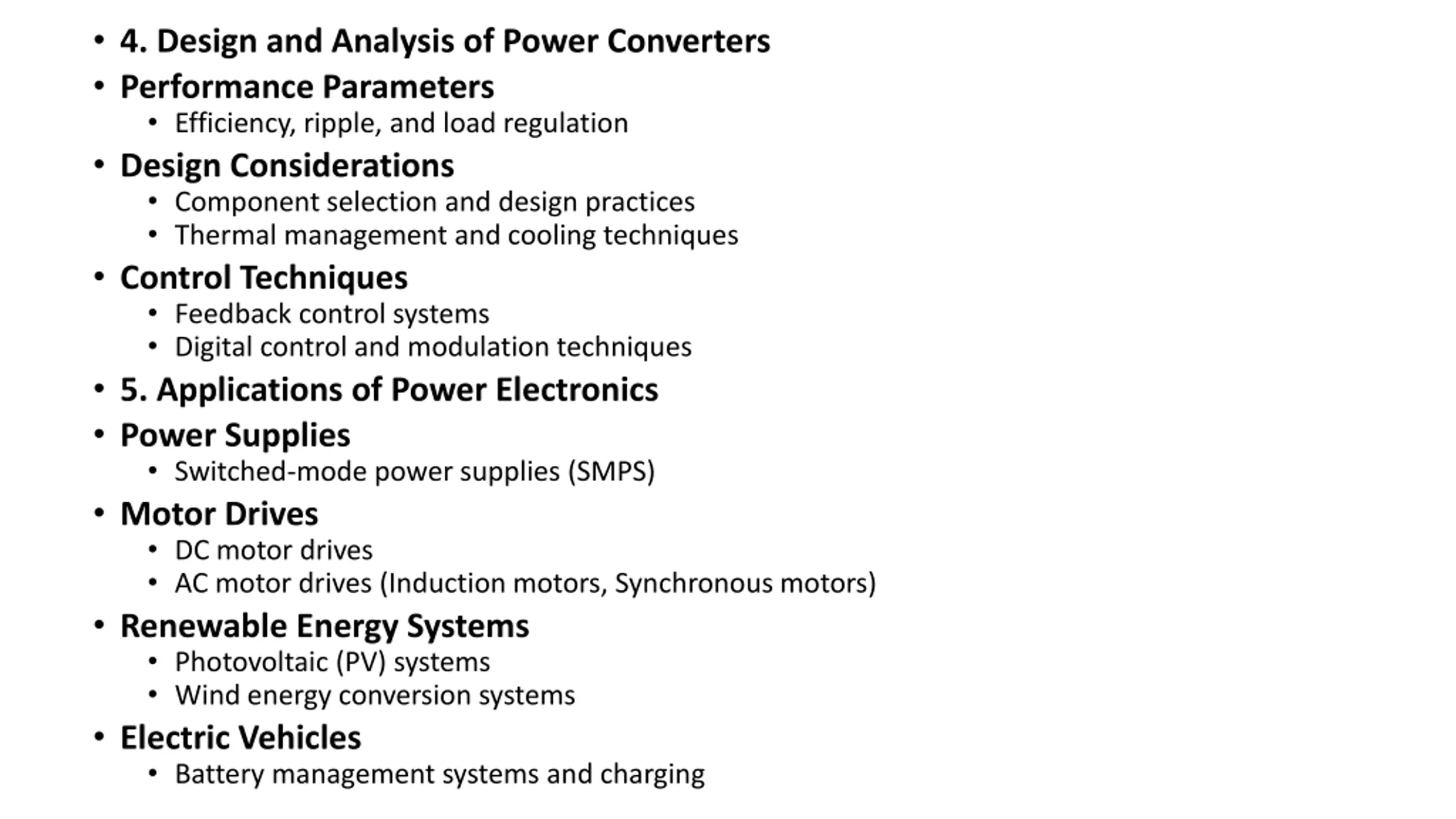 4. Design and Analysis of Power Converters Performance Parameters Efficiency, ripple, and load regulation Design Considerations Component selection and design practices Thermal management and cooling techniques Control Techniques Feedback control systems Digital control and modulation techniques 5. Applications of Power Electronics Power Supplies Switched-mode power supplies (SMPS) Motor Drives DC motor drives AC motor drives (Induction motors, Synchronous motors) Renewable Energy Systems Photovoltaic (PV) systems Wind energy conversion systems Electric Vehicles Battery management systems and charging