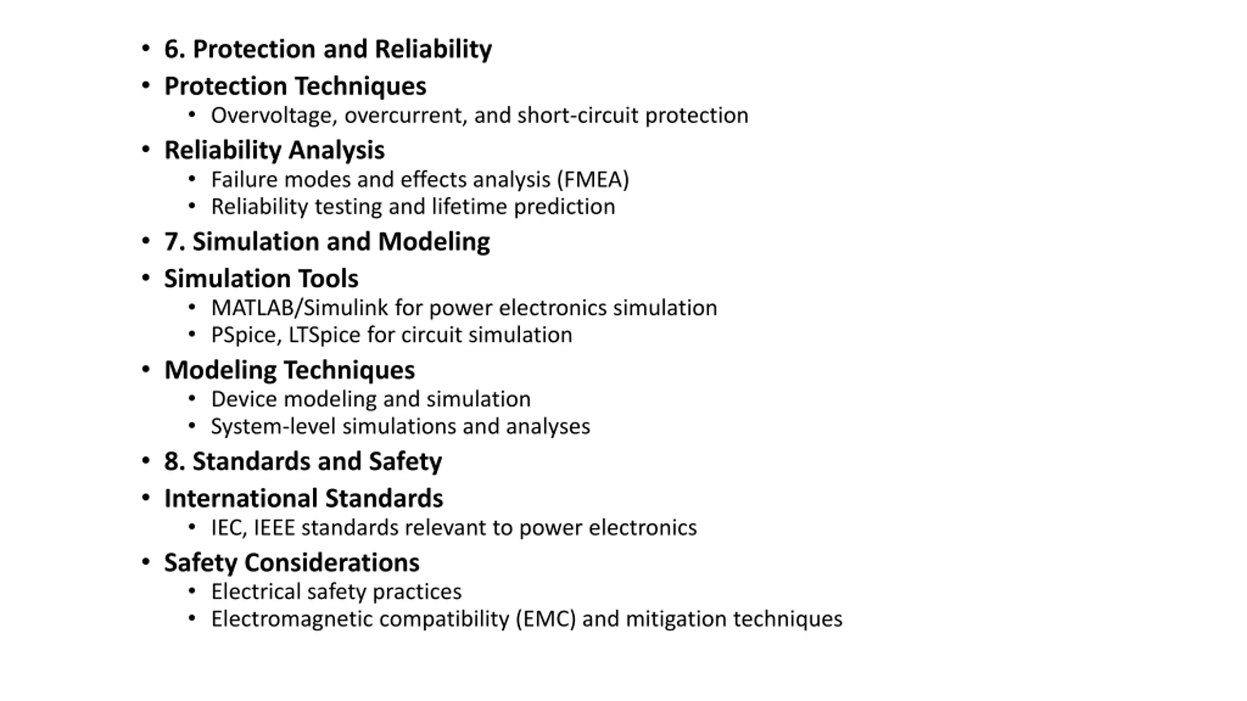 6. Protection and Reliability Protection Techniques Overvoltage, overcurrent, and short-circuit protection Reliability Analysis Failure modes and effects analysis (FMEA) Reliability testing and lifetime prediction 7. Simulation and Modeling Simulation Tools MATLAB/Simulink for power electronics simulation PSpice, LTSpice for circuit simulation Modeling Techniques Device modeling and simulation System-level simulations and analyses 8. Standards and Safety International Standards IEC, IEEE standards relevant to power electronics Safety Considerations Electrical safety practices Electromagnetic compatibility (EMC) and mitigation techniques