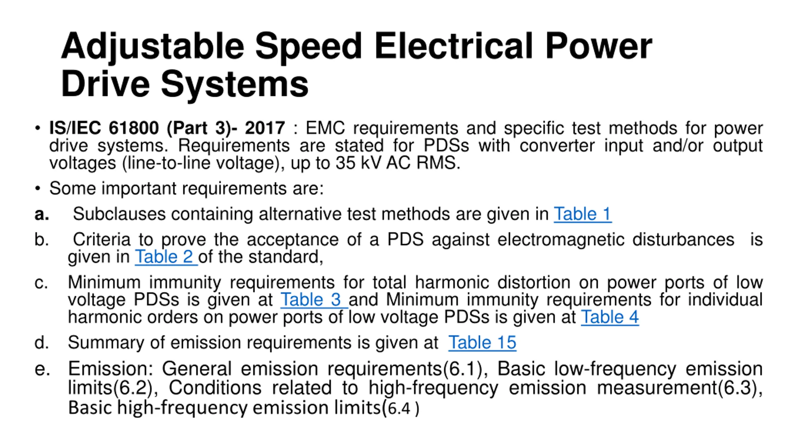 Adjustable Speed Electrical Power Drive Systems IS/IEC 61800 (Part 3)- 2017 : EMC requirements and specific test methods for power drive systems. Requirements are stated for PDSs with converter input and/or output voltages (line-to-line voltage), up to 35 kV AC RMS. Some important requirements are: a. Subclauses containing alternative test methods are given in Table 1 b. Criteria to prove the acceptance of a PDS against electromagnetic disturbances is given in Table 2 of the standard, c. Minimum immunity requirements for total harmonic distortion on power ports of low voltage PDSs is given at Table 3 and Minimum immunity requirements for individual harmonic orders on power ports of low voltage PDSs is given at Table 4 d. Summary of emission requirements is given at Table 15 e. Emission: General emission requirements(6.1), Basic low-frequency emission limits(6.2), Conditions related to high-frequency emission measurement(6.3), Basic high-frequency emission limits(6.4 )