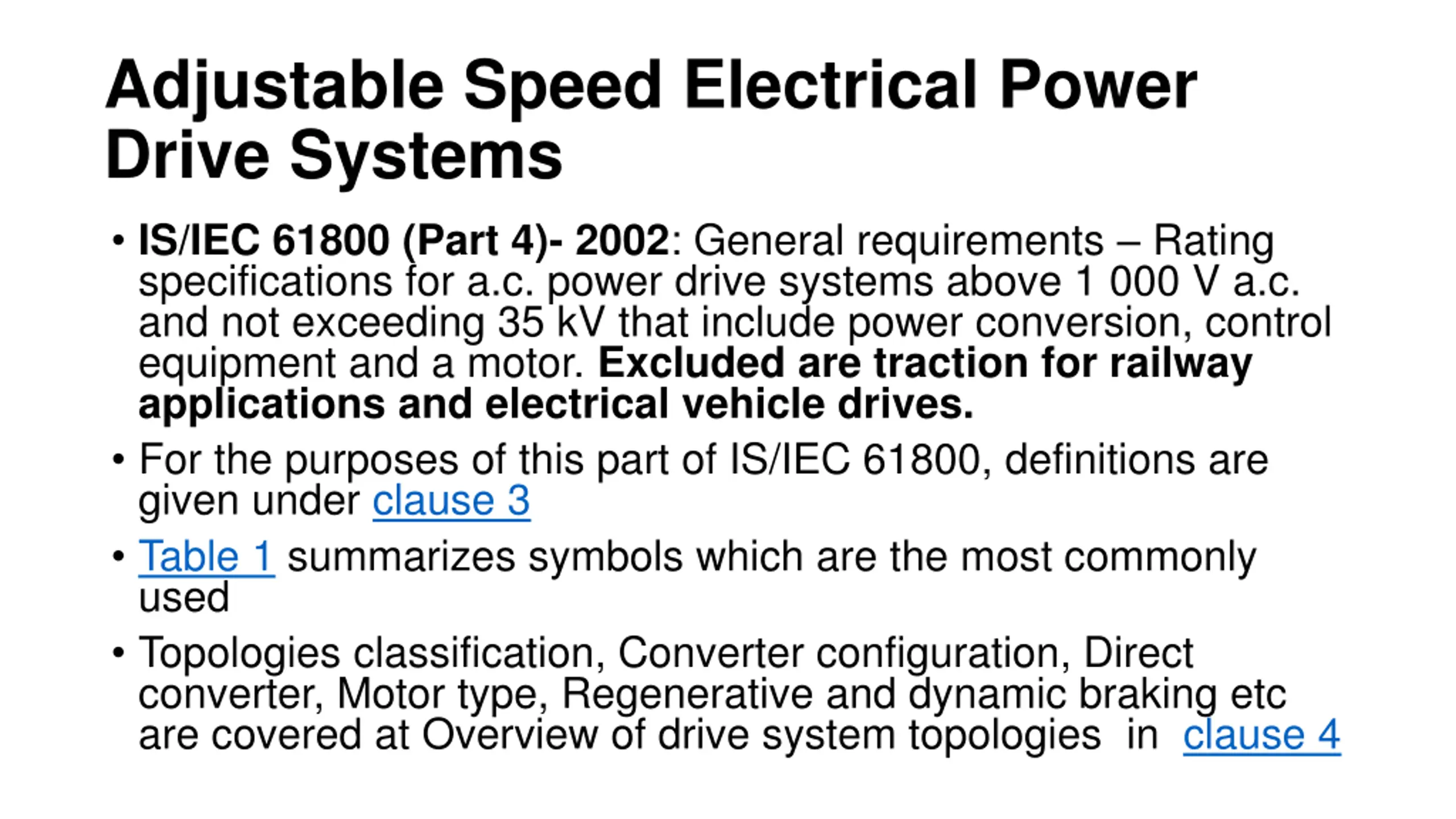 Adjustable Speed Electrical Power Drive Systems IS/IEC 61800 (Part 4)- 2002: General requirements Rating specifications for a.c. power drive systems above 1 000 V a.c. and not exceeding 35 kV that include power conversion, control equipment and a motor. Excluded are traction for railway applications and electrical vehicle drives. For the purposes of this part of IS/IEC 61800, definitions are given under clause 3 Table 1 summarizes symbols which are the most commonly used Topologies classification, Converter configuration, Direct converter, Motor type, Regenerative and dynamic braking etc are covered at Overview of drive system topologies in clause 4