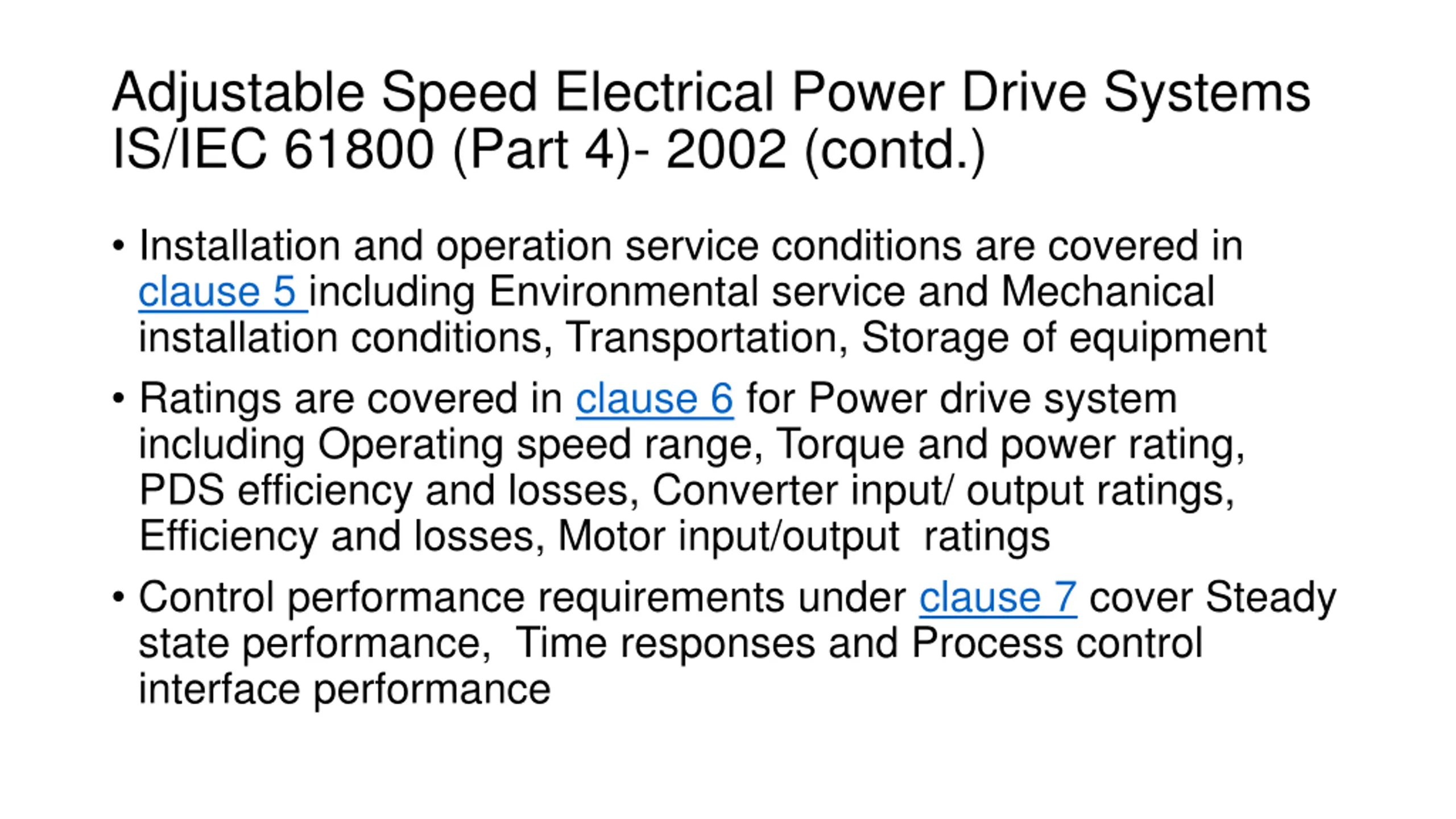 Adjustable Speed Electrical Power Drive Systems IS/IEC 61800 (Part 4)- 2002 (contd.) Installation and operation service conditions are covered in clause 5 including Environmental service and Mechanical installation conditions, Transportation, Storage of equipment Ratings are covered in clause 6 for Power drive system including Operating speed range, Torque and power rating, PDS efficiency and losses, Converter input/ output ratings, Efficiency and losses, Motor input/output ratings Control performance requirements under clause 7 cover Steady state performance, Time responses and Process control interface performance
