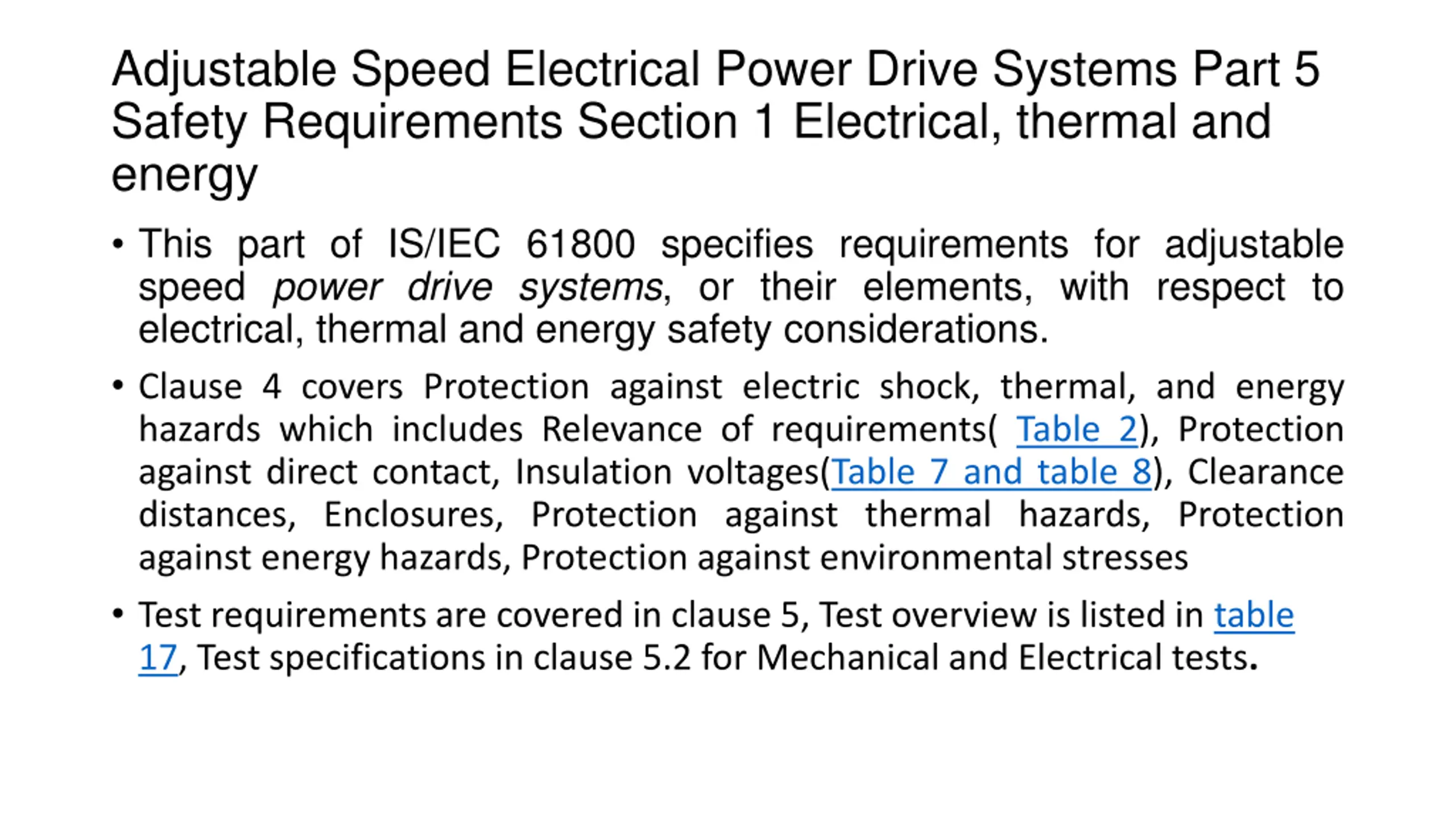 Adjustable Speed Electrical Power Drive Systems Part 5 Safety Requirements Section 1 Electrical, thermal and energy This part of IS/IEC 61800 specifies requirements for adjustable speed power drive systems, or their elements, with respect to electrical, thermal and energy safety considerations. Clause 4 covers Protection against electric shock, thermal, and energy hazards which includes Relevance of requirements( Table 2), Protection against direct contact, Insulation voltages(Table 7 and table 8), Clearance distances, Enclosures, Protection against thermal hazards, Protection against energy hazards, Protection against environmental stresses Test requirements are covered in clause 5, Test overview is listed in table 17, Test specifications in clause 5.2 for Mechanical and Electrical tests.