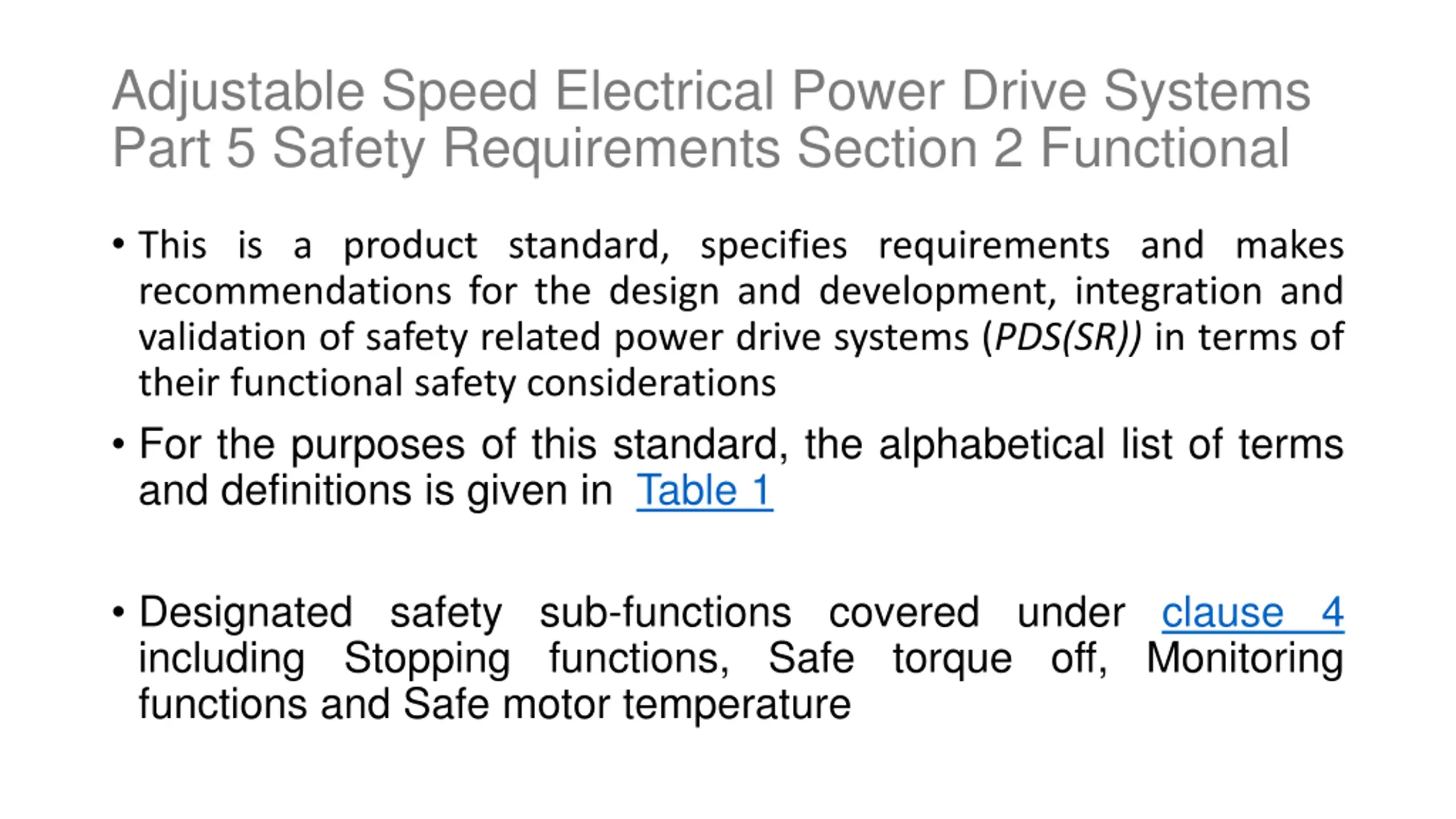 Adjustable Speed Electrical Power Drive Systems Part 5 Safety Requirements Section 2 Functional This is a product standard, specifies requirements and makes recommendations for the design and development, integration and validation of safety related power drive systems (PDS(SR)) in terms of their functional safety considerations For the purposes of this standard, the alphabetical list of terms and definitions is given in Table 1 Designated safety sub-functions covered under clause 4 including Stopping functions, Safe torque off, Monitoring functions and Safe motor temperature