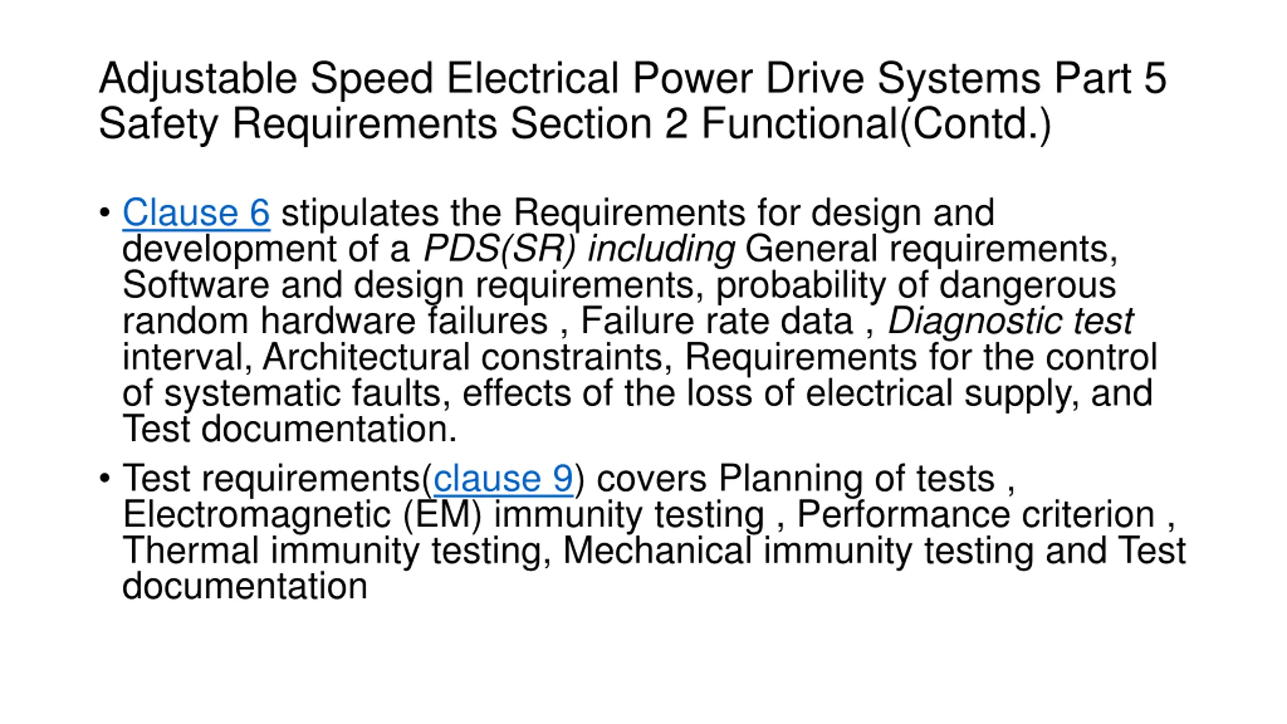 Adjustable Speed Electrical Power Drive Systems Part 5 Safety Requirements Section 2 Functional(Contd.) Clause 6 stipulates the Requirements for design and development of a PDS(SR) including General requirements, Software and design requirements, probability of dangerous random hardware failures , Failure rate data , Diagnostic test interval, Architectural constraints, Requirements for the control of systematic faults, effects of the loss of electrical supply, and Test documentation. Test requirements(clause 9) covers Planning of tests , Electromagnetic (EM) immunity testing , Performance criterion , Thermal immunity testing, Mechanical immunity testing and Test documentation