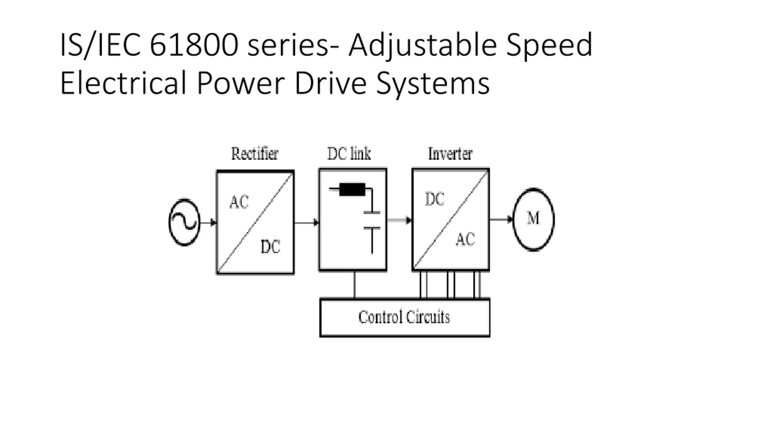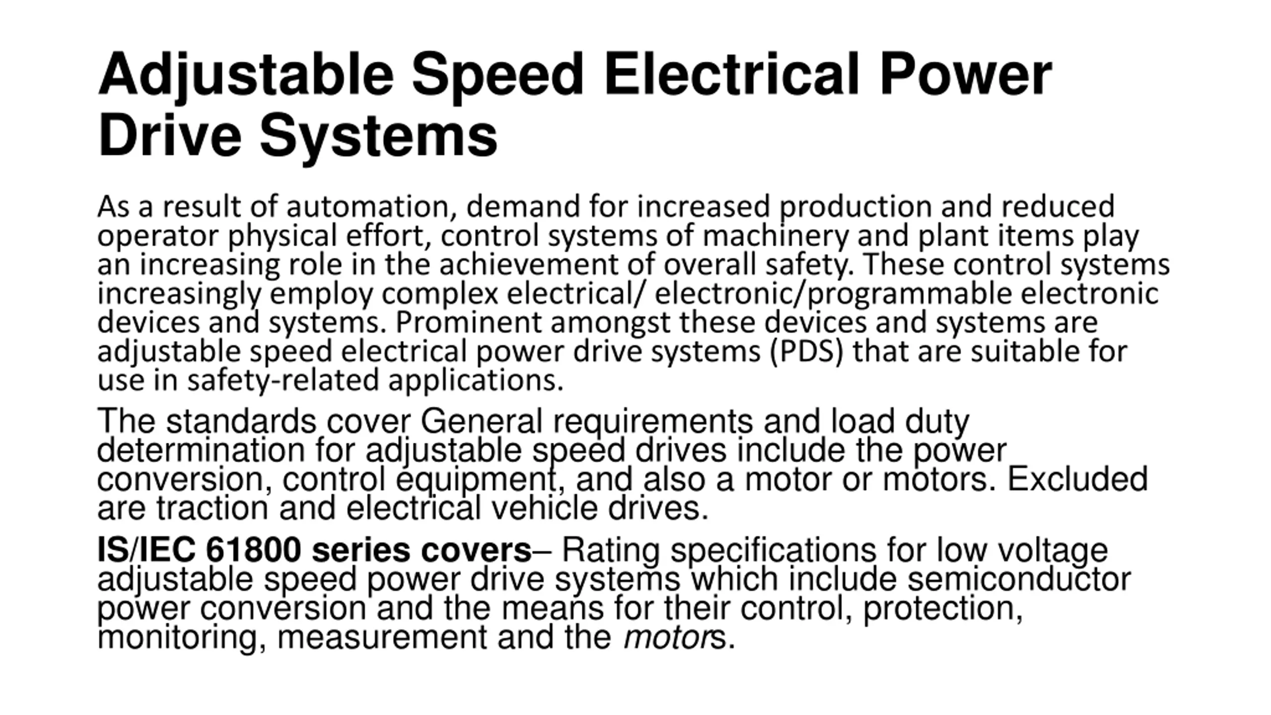 Adjustable Speed Electrical Power Drive Systems As a result of automation, demand for increased production and reduced operator physical effort, control systems of machinery and plant items play an increasing role in the achievement of overall safety. These control systems increasingly employ complex electrical/ electronic/programmable electronic devices and systems. Prominent amongst these devices and systems are adjustable speed electrical power drive systems (PDS) that are suitable for use in safety-related applications. The standards cover General requirements and load duty determination for adjustable speed drives include the power conversion, control equipment, and also a motor or motors. Excluded are traction and electrical vehicle drives. IS/IEC 61800 series covers Rating specifications for low voltage adjustable speed power drive systems which include semiconductor power conversion and the means for their control, protection, monitoring, measurement and the motors.