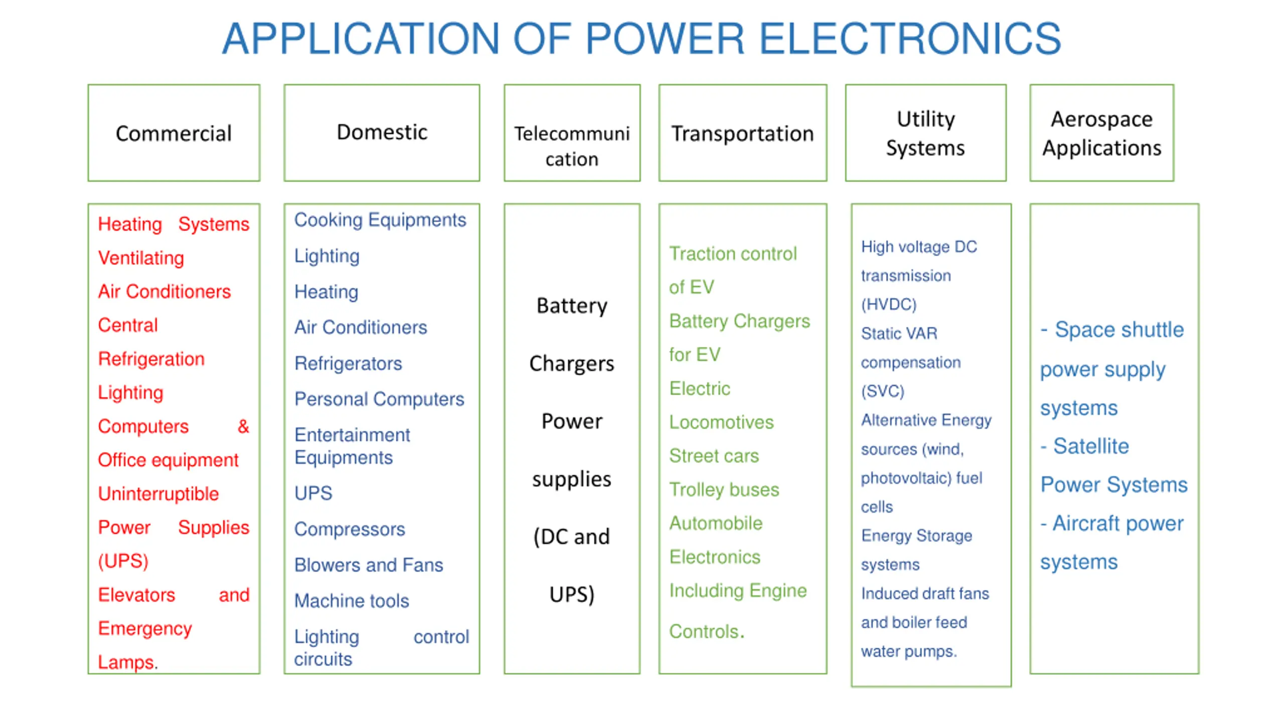 APPLICATION OF POWER ELECTRONICS Utility Systems Aerospace Applications Domestic Commercial Transportation Telecommuni cation Cooking Equipments Heating Systems High voltage DC Traction control Lighting Ventilating transmission of EV Air Conditioners Heating (HVDC) Battery Battery Chargers Central - Space shuttle Air Conditioners Static VAR for EV Refrigeration Refrigerators compensation Chargers power supply Electric Lighting (SVC) Personal Computers systems Alternative Energy Power Locomotives Computers & Entertainment Equipments - Satellite sources (wind, Street cars Office equipment photovoltaic) fuel supplies Power Systems Trolley buses UPS Uninterruptible cells - Aircraft power Automobile Power Supplies Compressors Energy Storage (DC and Electronics systems (UPS) Blowers and Fans systems Including Engine Elevators and Induced draft fans UPS) Machine tools and boiler feed Controls. Emergency Lighting circuits control water pumps. Lamps.