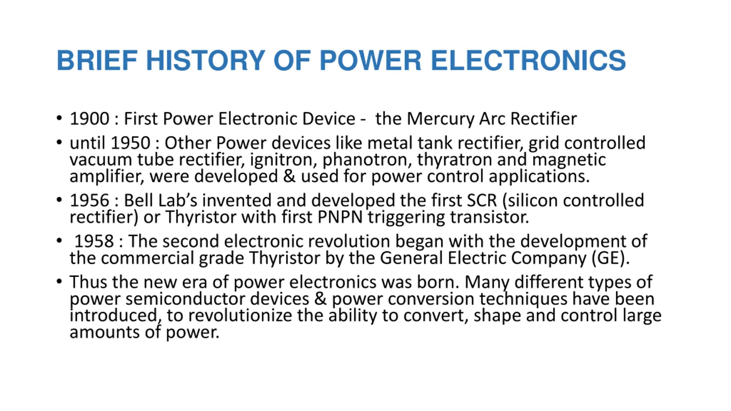 BRIEF HISTORY OF POWER ELECTRONICS 1900 : First Power Electronic Device - the Mercury Arc Rectifier until 1950 : Other Power devices like metal tank rectifier, grid controlled vacuum tube rectifier, ignitron, phanotron, thyratron and magnetic amplifier, were developed & used for power control applications. 1956 : Bell Lab s invented and developed the first SCR (silicon controlled rectifier) or Thyristor with first PNPN triggering transistor. 1958 : The second electronic revolution began with the development of the commercial grade Thyristor by the General Electric Company (GE). Thus the new era of power electronics was born. Many different types of power semiconductor devices & power conversion techniques have been introduced, to revolutionize the ability to convert, shape and control large amounts of power.