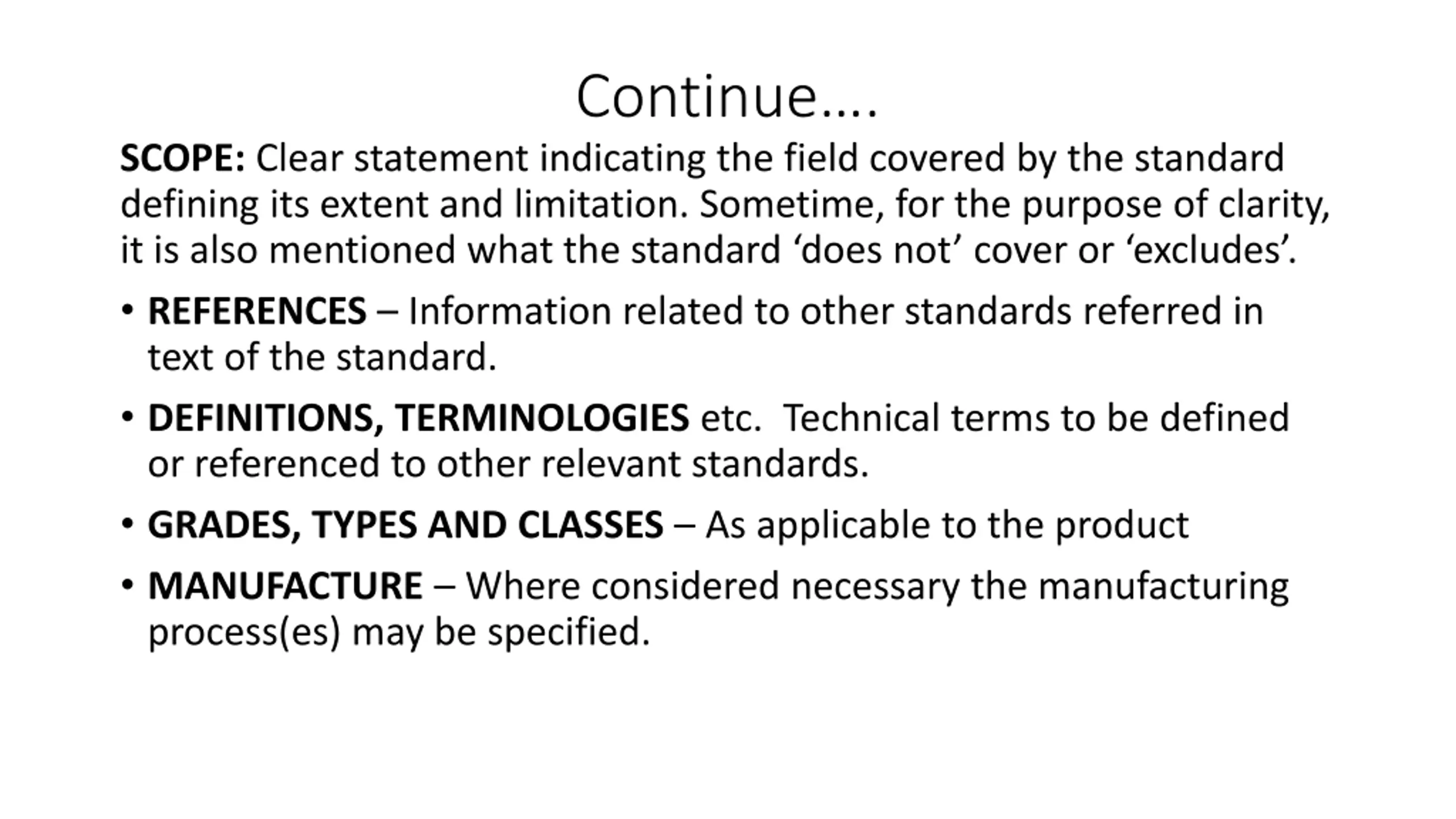 Continue. SCOPE: Clear statement indicating the field covered by the standard defining its extent and limitation. Sometime, for the purpose of clarity, it is also mentioned what the standard does not cover or excludes . REFERENCES Information related to other standards referred in text of the standard. DEFINITIONS, TERMINOLOGIES etc. Technical terms to be defined or referenced to other relevant standards. GRADES, TYPES AND CLASSES As applicable to the product MANUFACTURE Where considered necessary the manufacturing process(es) may be specified.
