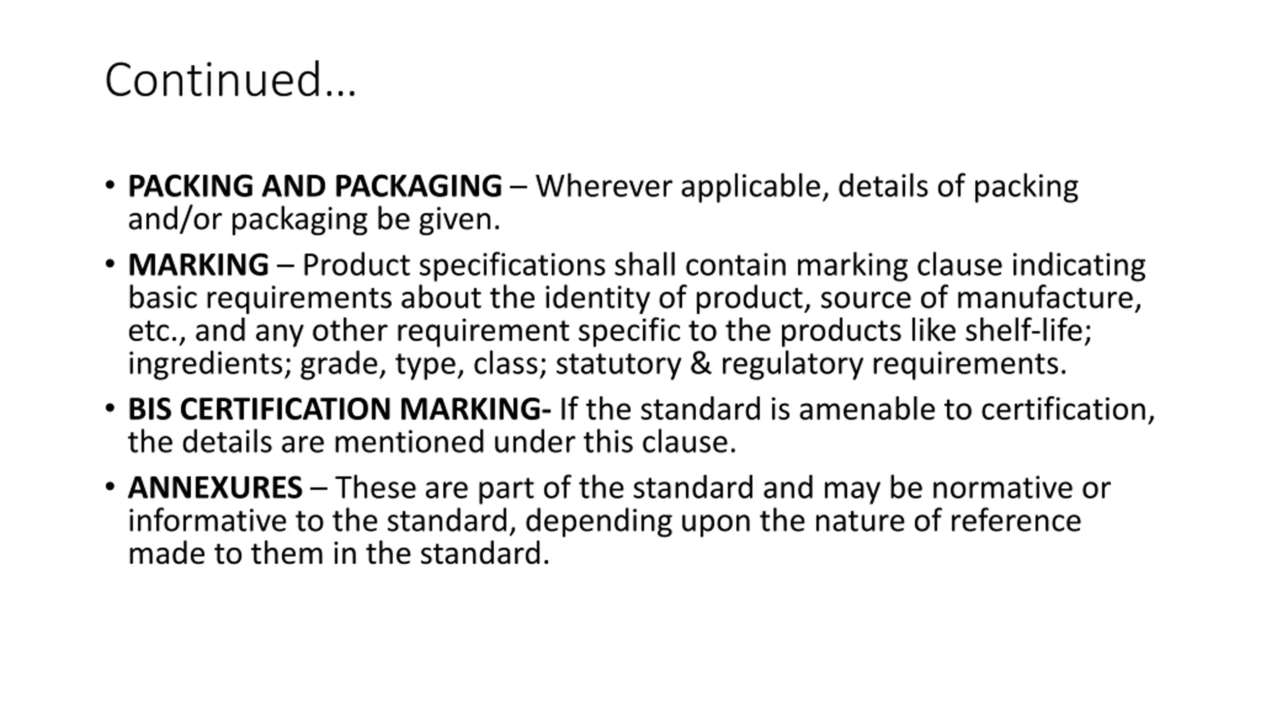 Continued PACKING AND PACKAGING Wherever applicable, details of packing and/or packaging be given. MARKING Product specifications shall contain marking clause indicating basic requirements about the identity of product, source of manufacture, etc., and any other requirement specific to the products like shelf-life; ingredients; grade, type, class; statutory & regulatory requirements. BIS CERTIFICATION MARKING- If the standard is amenable to certification, the details are mentioned under this clause. ANNEXURES These are part of the standard and may be normative or informative to the standard, depending upon the nature of reference made to them in the standard.