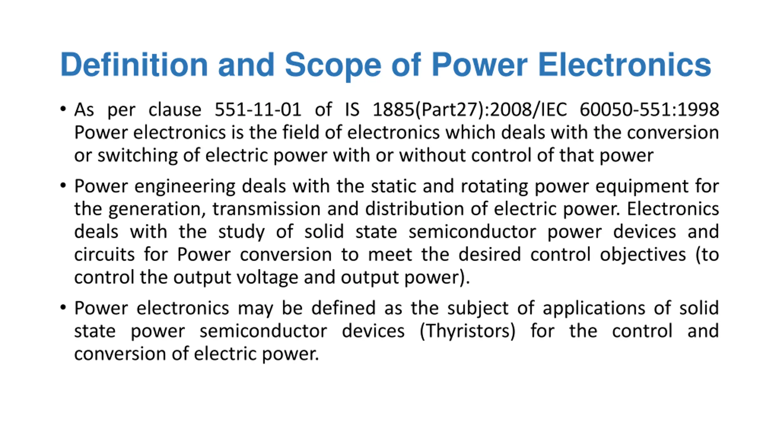 Definition and Scope of Power Electronics As per clause 551-11-01 of IS 1885(Part27):2008/IEC 60050-551:1998 Power electronics is the field of electronics which deals with the conversion or switching of electric power with or without control of that power Power engineering deals with the static and rotating power equipment for the generation, transmission and distribution of electric power. Electronics deals with the study of solid state semiconductor power devices and circuits for Power conversion to meet the desired control objectives (to control the output voltage and output power). Power electronics may be defined as the subject of applications of solid state power semiconductor devices (Thyristors) for the control and conversion of electric power.