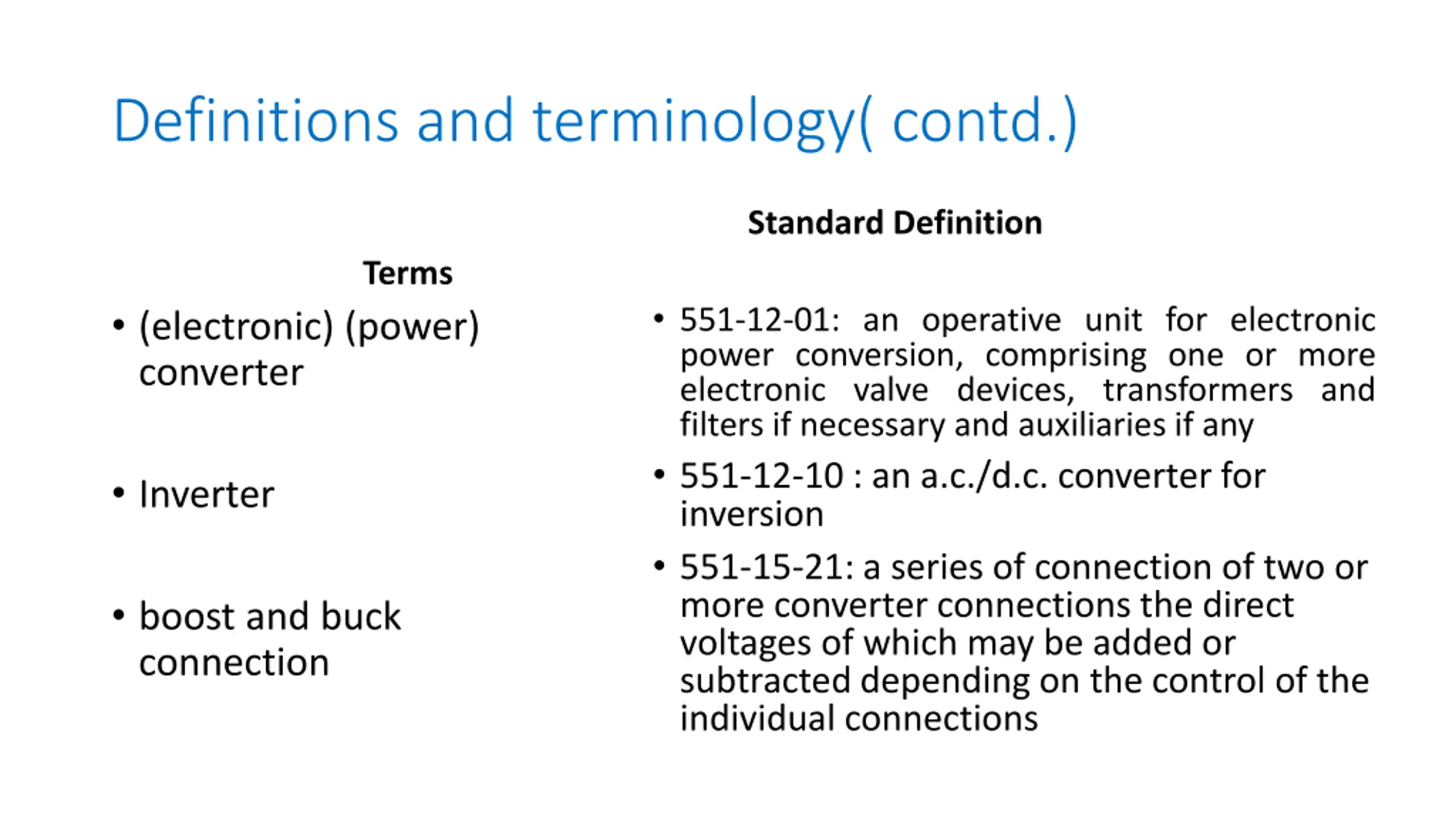 Definitions and terminology( contd.) Standard Definition Terms 551-12-01: an operative unit for electronic power conversion, comprising one or more electronic valve devices, transformers and filters if necessary and auxiliaries if any 551-12-10 : an a.c./d.c. converter for inversion 551-15-21: a series of connection of two or more converter connections the direct voltages of which may be added or subtracted depending on the control of the individual connections (electronic) (power) converter Inverter boost and buck connection