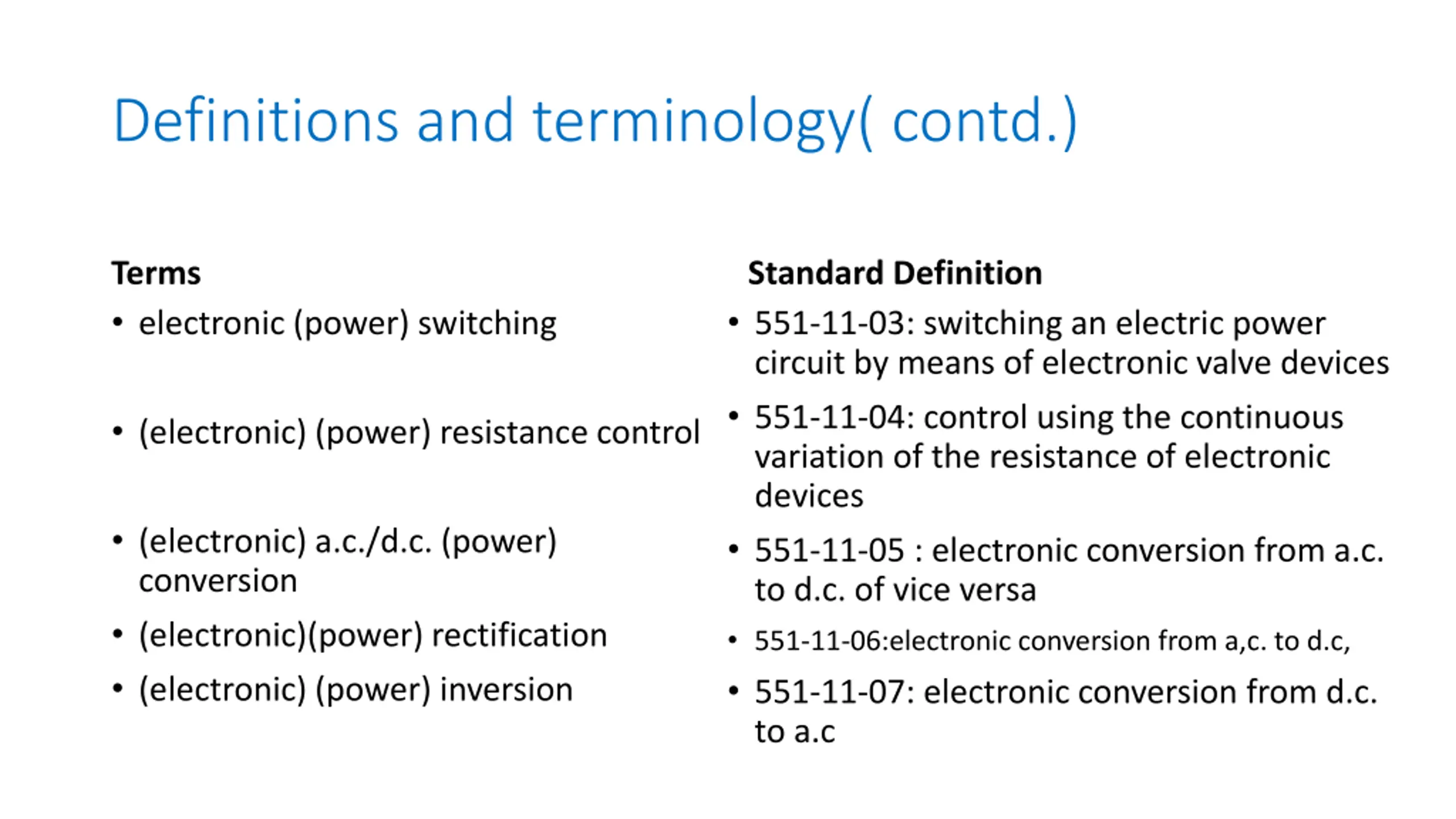 Definitions and terminology( contd.) Terms electronic (power) switching Standard Definition 551-11-03: switching an electric power circuit by means of electronic valve devices 551-11-04: control using the continuous variation of the resistance of electronic devices 551-11-05 : electronic conversion from a.c. to d.c. of vice versa 551-11-06:electronic conversion from a,c. to d.c, 551-11-07: electronic conversion from d.c. to a.c (electronic) (power) resistance control (electronic) a.c./d.c. (power) conversion (electronic)(power) rectification (electronic) (power) inversion