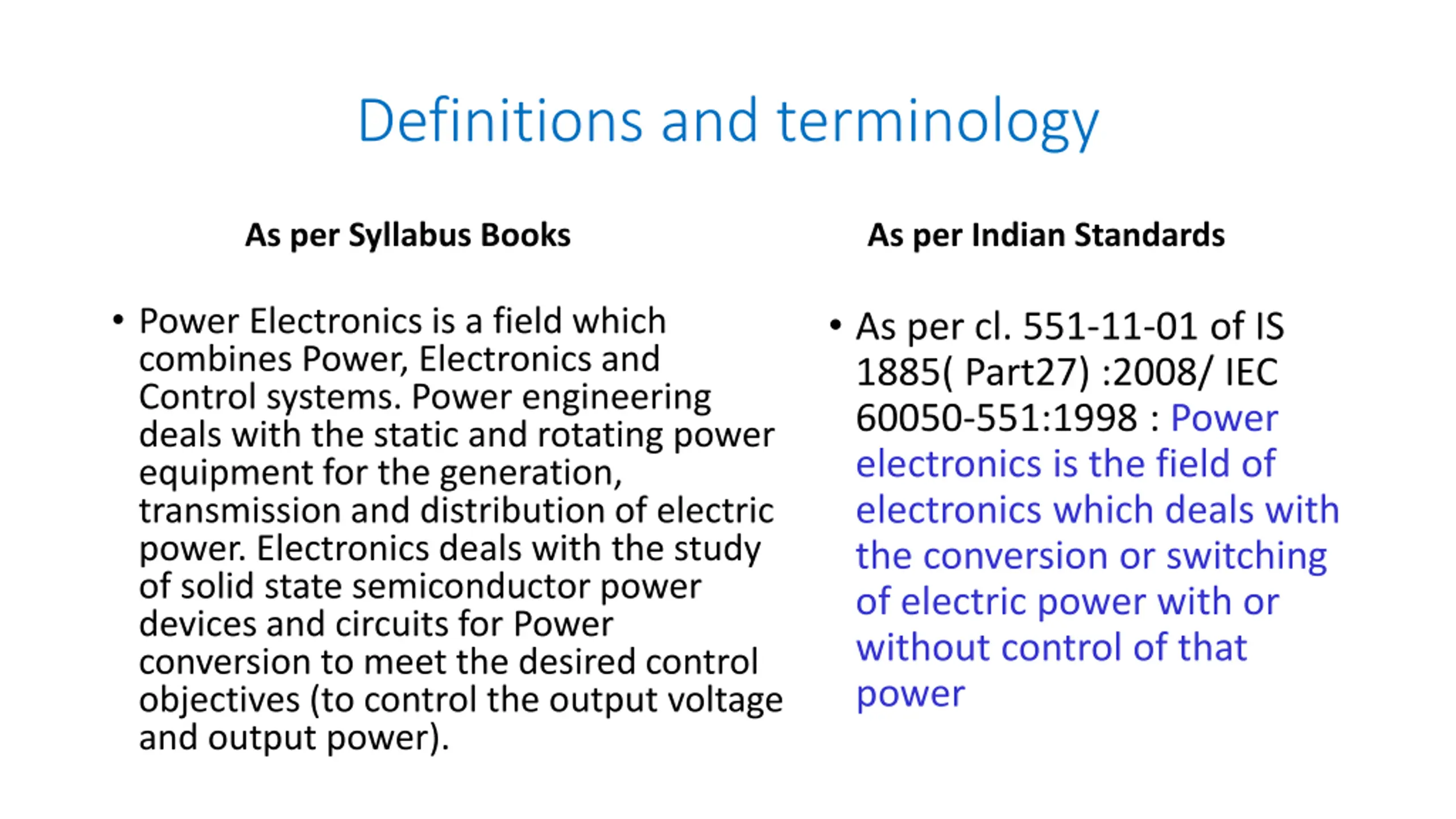 Definitions and terminology As per Syllabus Books As per Indian Standards Power Electronics is a field which combines Power, Electronics and Control systems. Power engineering deals with the static and rotating power equipment for the generation, transmission and distribution of electric power. Electronics deals with the study of solid state semiconductor power devices and circuits for Power conversion to meet the desired control objectives (to control the output voltage and output power). As per cl. 551-11-01 of IS 1885( Part27) :2008/ IEC 60050-551:1998 : Power electronics is the field of electronics which deals with the conversion or switching of electric power with or without control of that power