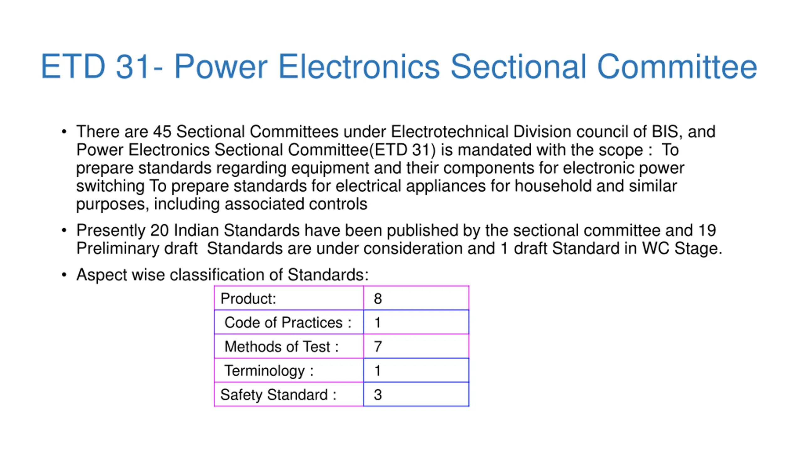 ETD 31- Power Electronics Sectional Committee There are 45 Sectional Committees under Electrotechnical Division council of BIS, and Power Electronics Sectional Committee(ETD 31) is mandated with the scope : To prepare standards regarding equipment and their components for electronic power switching To prepare standards for electrical appliances for household and similar purposes, including associated controls Presently 20 Indian Standards have been published by the sectional committee and 19 Preliminary draft Standards are under consideration and 1 draft Standard in WC Stage. Aspect wise classification of Standards: Product: 8 Code of Practices : 1 Methods of Test : 7 Terminology : 1 Safety Standard : 3