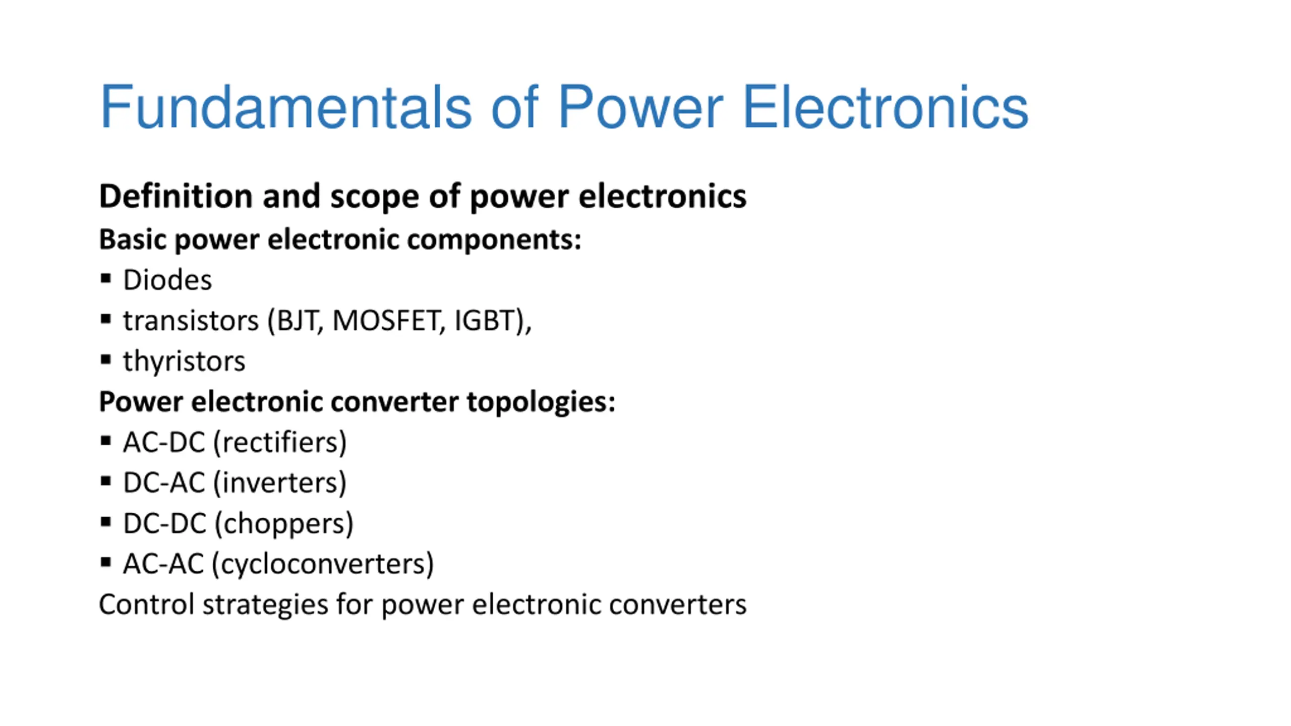 Fundamentals of Power Electronics Definition and scope of power electronics Basic power electronic components: Diodes transistors (BJT, MOSFET, IGBT), thyristors Power electronic converter topologies: AC-DC (rectifiers) DC-AC (inverters) DC-DC (choppers) AC-AC (cycloconverters) Control strategies for power electronic converters