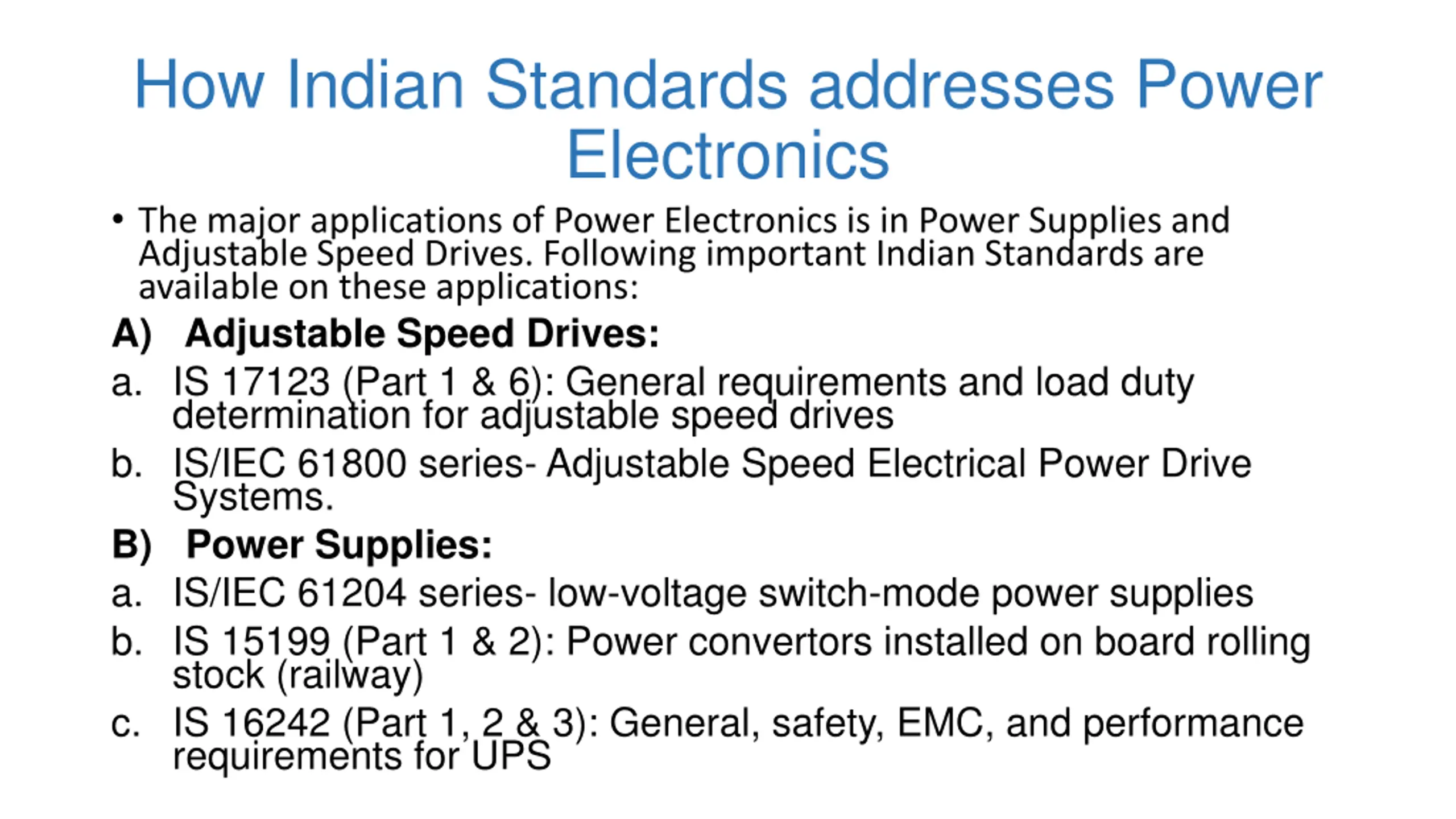 How Indian Standards addresses Power Electronics The major applications of Power Electronics is in Power Supplies and Adjustable Speed Drives. Following important Indian Standards are available on these applications: A) Adjustable Speed Drives: a. IS 17123 (Part 1 & 6): General requirements and load duty determination for adjustable speed drives b. IS/IEC 61800 series- Adjustable Speed Electrical Power Drive Systems. B) Power Supplies: a. IS/IEC 61204 series- low-voltage switch-mode power supplies b. IS 15199 (Part 1 & 2): Power convertors installed on board rolling stock (railway) c. IS 16242 (Part 1, 2 & 3): General, safety, EMC, and performance requirements for UPS
