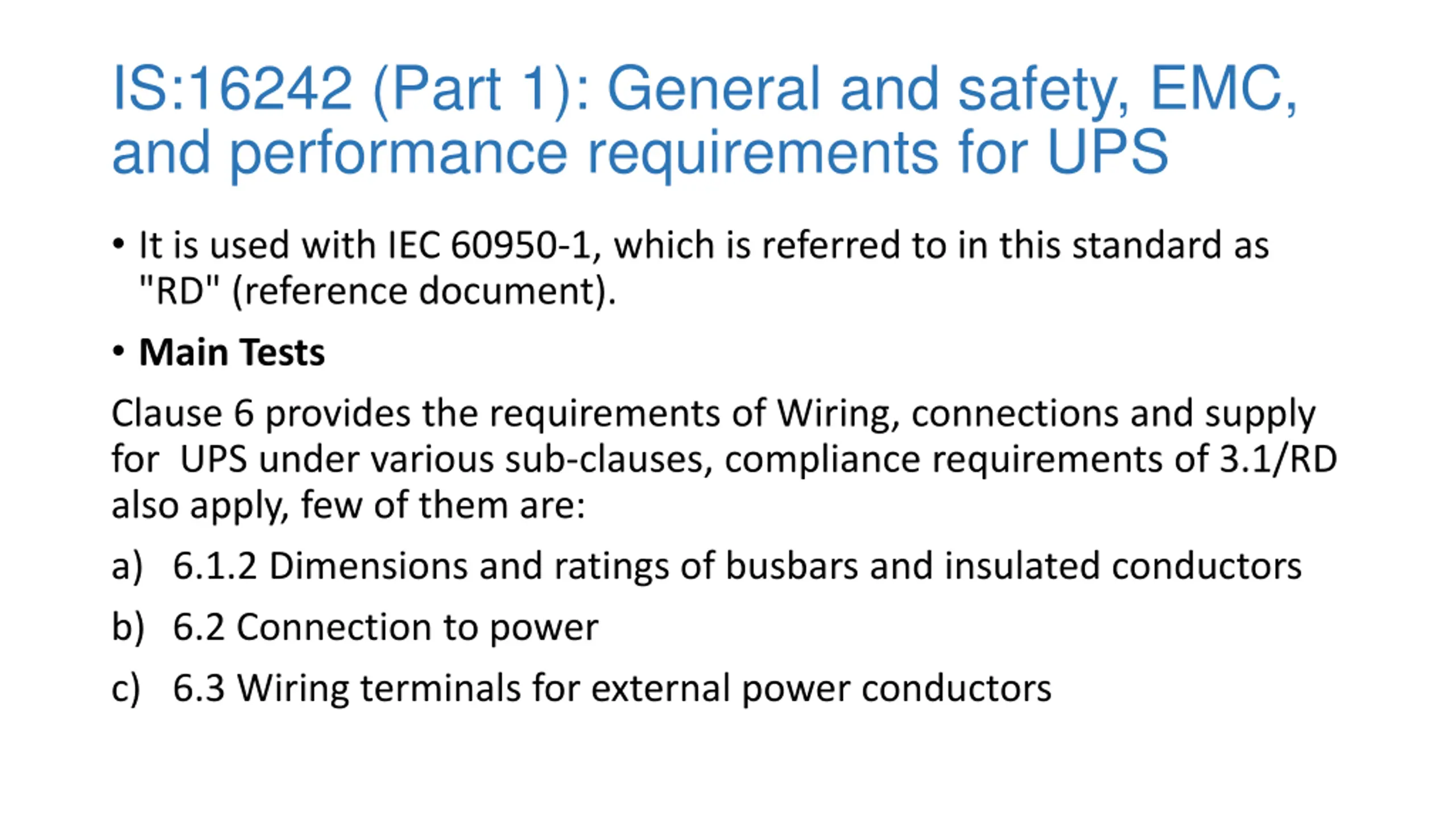 IS:16242 (Part 1): General and safety, EMC, and performance requirements for UPS It is used with IEC 60950-1, which is referred to in this standard as "RD" (reference document). Main Tests Clause 6 provides the requirements of Wiring, connections and supply for UPS under various sub-clauses, compliance requirements of 3.1/RD also apply, few of them are: a) 6.1.2 Dimensions and ratings of busbars and insulated conductors b) 6.2 Connection to power c) 6.3 Wiring terminals for external power conductors