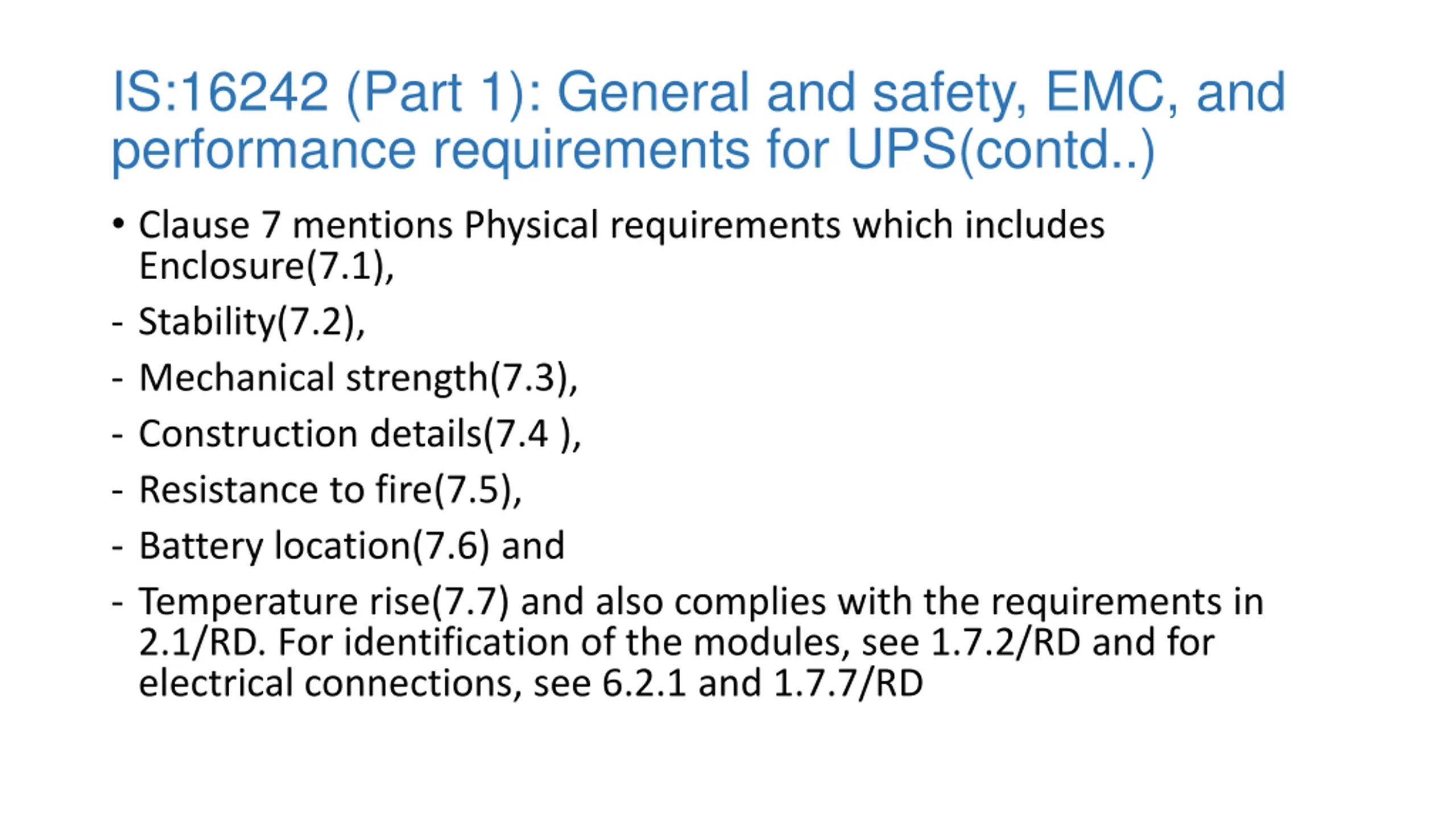 IS:16242 (Part 1): General and safety, EMC, and performance requirements for UPS(contd..) Clause 7 mentions Physical requirements which includes Enclosure(7.1), - Stability(7.2), - Mechanical strength(7.3), - Construction details(7.4 ), - Resistance to fire(7.5), - Battery location(7.6) and - Temperature rise(7.7) and also complies with the requirements in 2.1/RD. For identification of the modules, see 1.7.2/RD and for electrical connections, see 6.2.1 and 1.7.7/RD