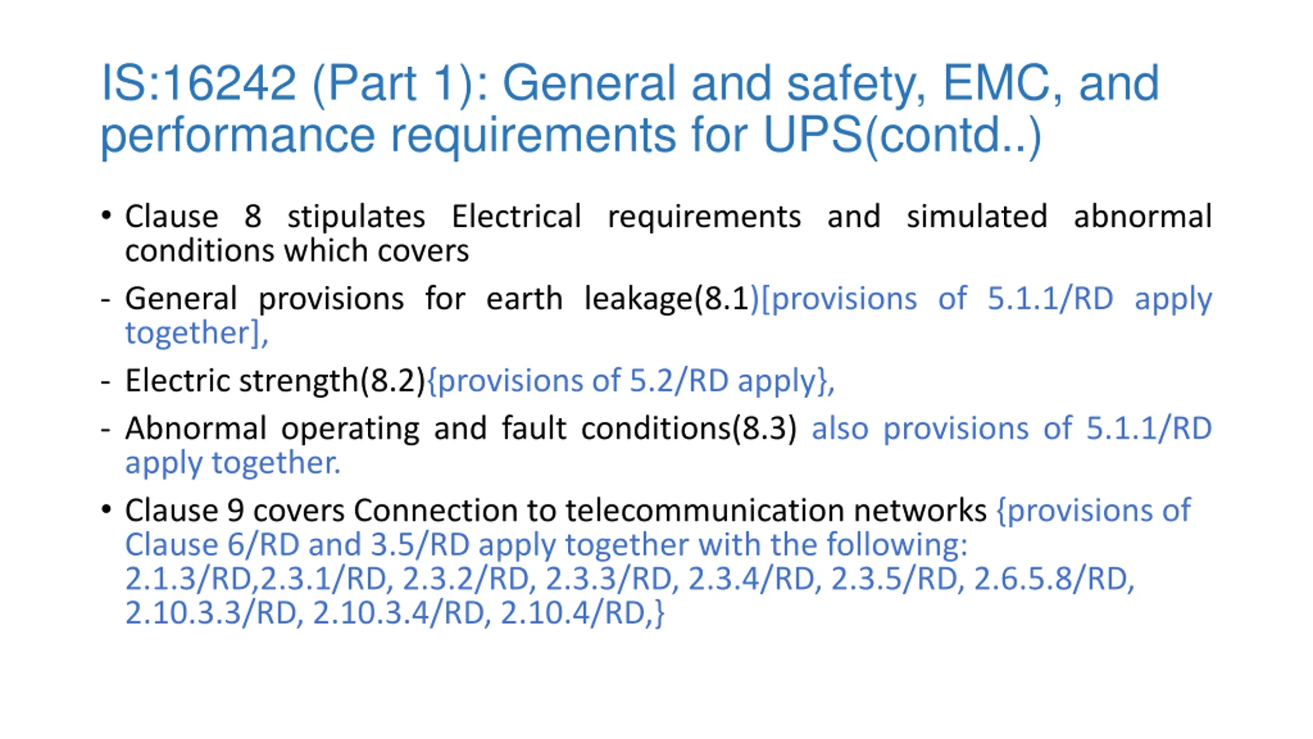 IS:16242 (Part 1): General and safety, EMC, and performance requirements for UPS(contd..) Clause 8 stipulates Electrical requirements and simulated abnormal conditions which covers - General provisions for earth leakage(8.1)[provisions of 5.1.1/RD apply together], - Electric strength(8.2){provisions of 5.2/RD apply}, - Abnormal operating and fault conditions(8.3) also provisions of 5.1.1/RD apply together. Clause 9 covers Connection to telecommunication networks {provisions of Clause 6/RD and 3.5/RD apply together with the following: 2.1.3/RD,2.3.1/RD, 2.3.2/RD, 2.3.3/RD, 2.3.4/RD, 2.3.5/RD, 2.6.5.8/RD, 2.10.3.3/RD, 2.10.3.4/RD, 2.10.4/RD,}