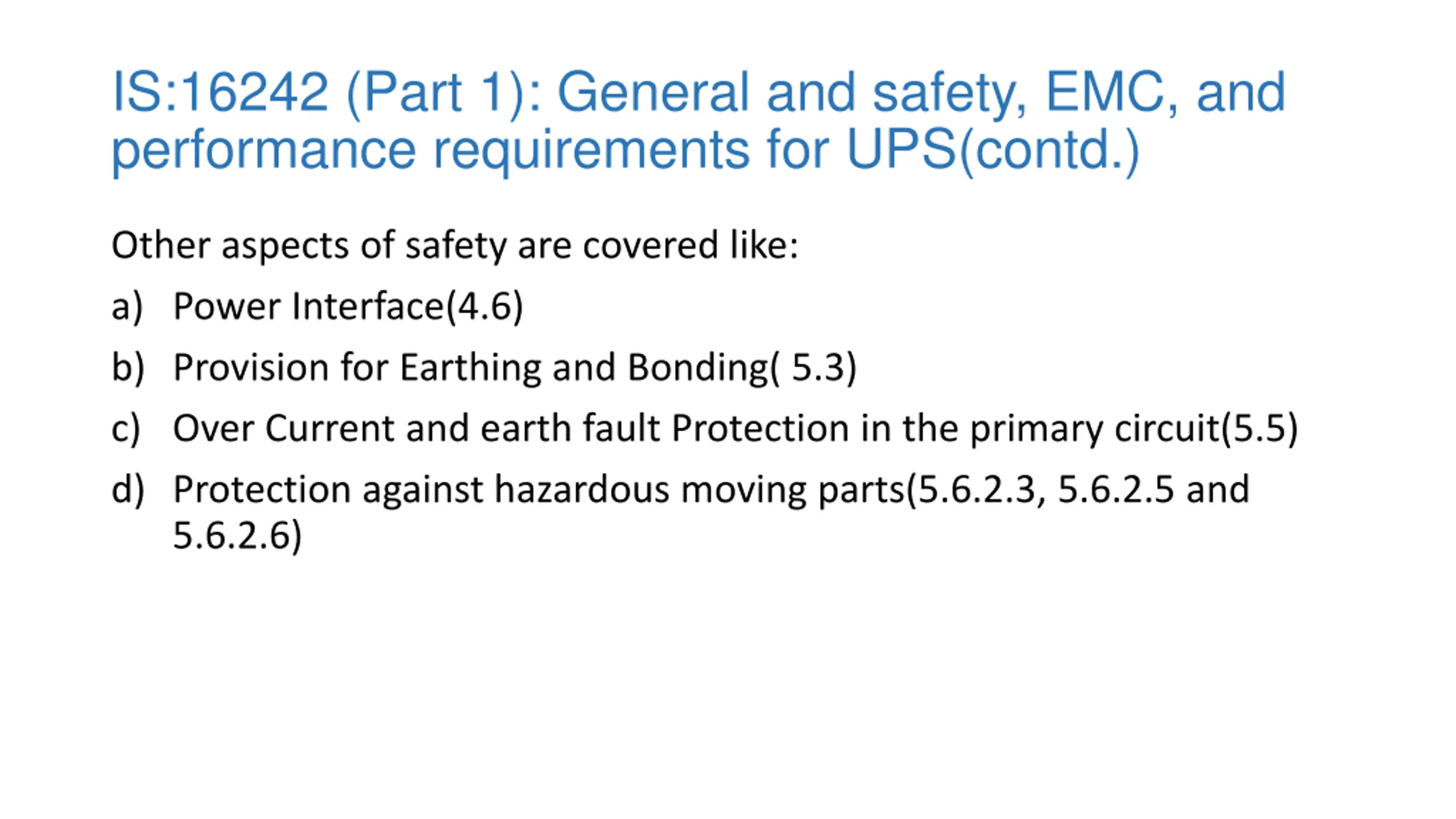 IS:16242 (Part 1): General and safety, EMC, and performance requirements for UPS(contd.) Other aspects of safety are covered like: a) Power Interface(4.6) b) Provision for Earthing and Bonding( 5.3) c) Over Current and earth fault Protection in the primary circuit(5.5) d) Protection against hazardous moving parts(5.6.2.3, 5.6.2.5 and 5.6.2.6)