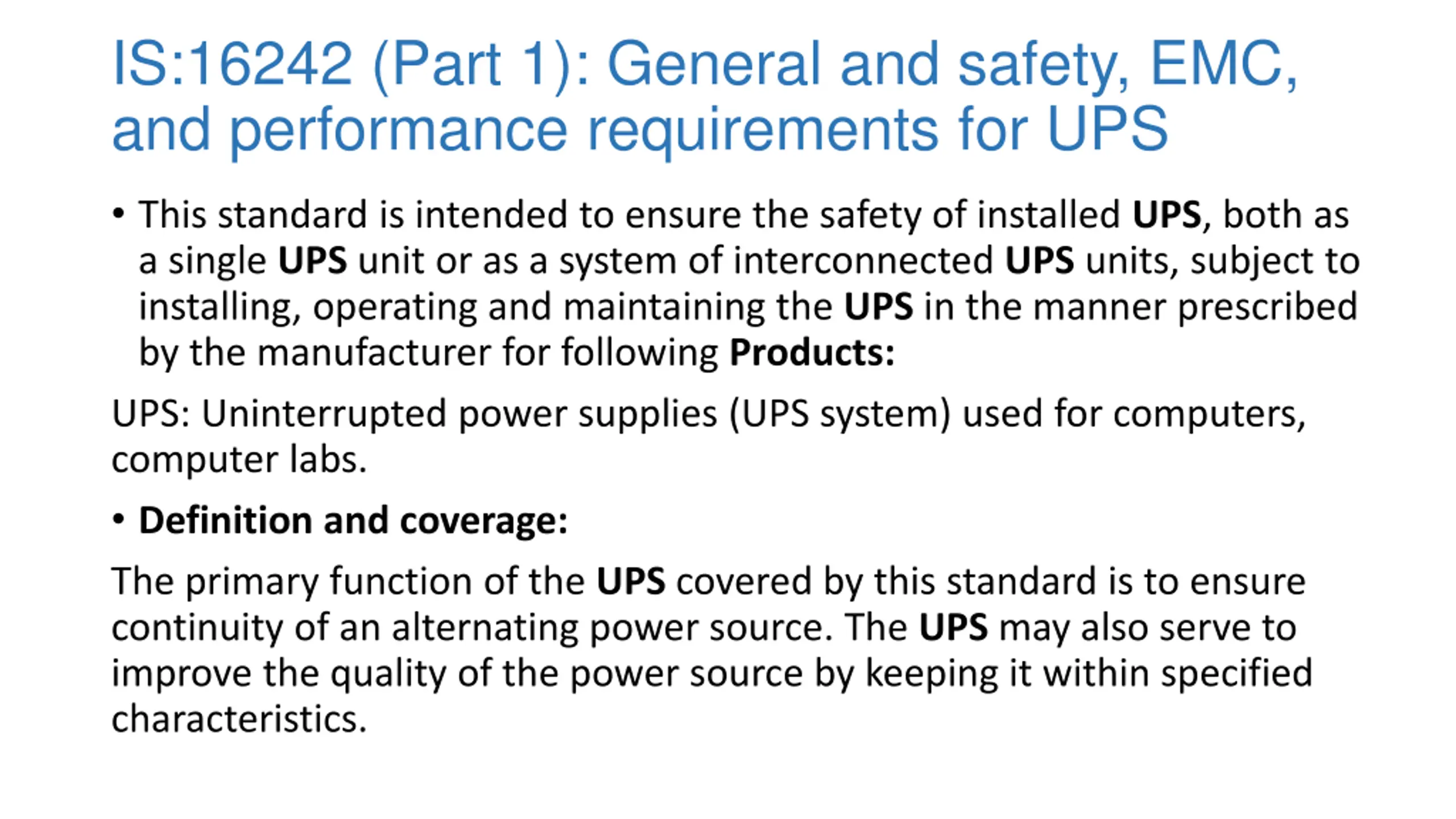 IS:16242 (Part 1): General and safety, EMC, and performance requirements for UPS This standard is intended to ensure the safety of installed UPS, both as a single UPS unit or as a system of interconnected UPS units, subject to installing, operating and maintaining the UPS in the manner prescribed by the manufacturer for following Products: UPS: Uninterrupted power supplies (UPS system) used for computers, computer labs. Definition and coverage: The primary function of the UPS covered by this standard is to ensure continuity of an alternating power source. The UPS may also serve to improve the quality of the power source by keeping it within specified characteristics.
