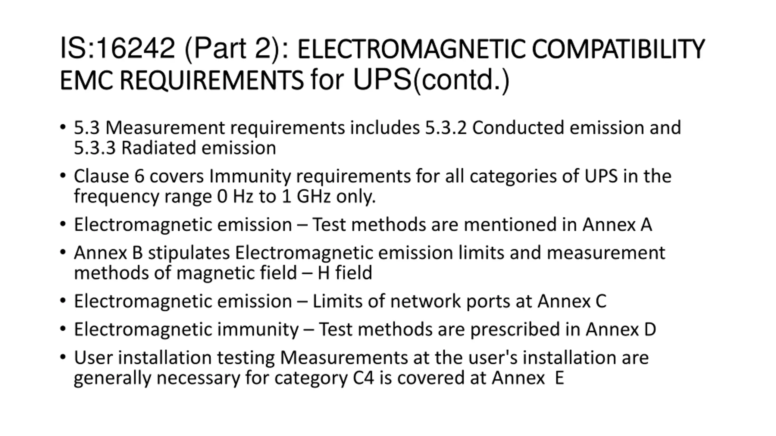 IS:16242 (Part 2): ELECTROMAGNETIC COMPATIBILITY ELECTROMAGNETIC COMPATIBILITY EMC REQUIREMENTS EMC REQUIREMENTS for UPS(contd.) 5.3 Measurement requirements includes 5.3.2 Conducted emission and 5.3.3 Radiated emission Clause 6 covers Immunity requirements for all categories of UPS in the frequency range 0 Hz to 1 GHz only. Electromagnetic emission Test methods are mentioned in Annex A Annex B stipulates Electromagnetic emission limits and measurement methods of magnetic field H field Electromagnetic emission Limits of network ports at Annex C Electromagnetic immunity Test methods are prescribed in Annex D User installation testing Measurements at the user's installation are generally necessary for category C4 is covered at Annex E