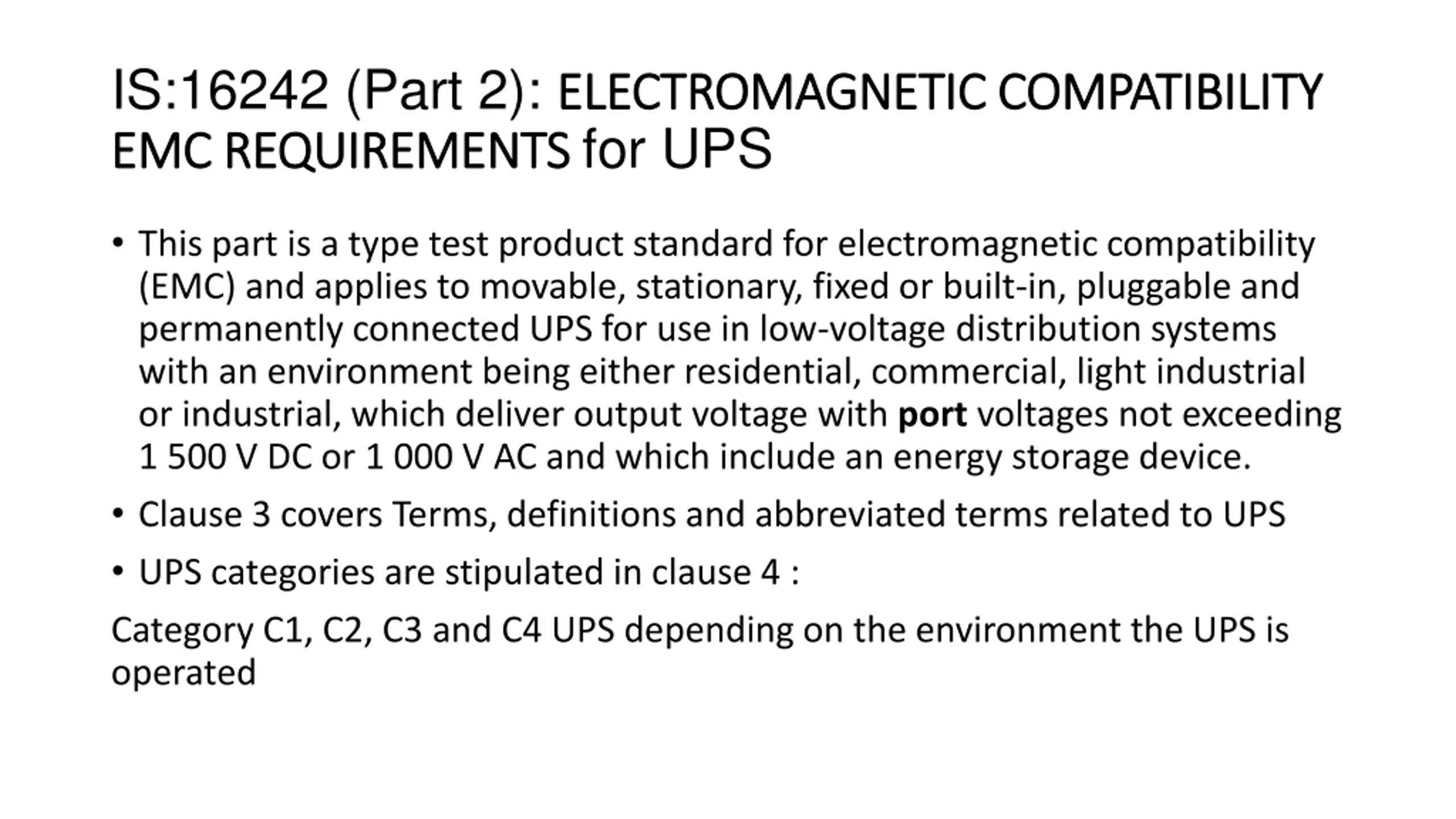 IS:16242 (Part 2): ELECTROMAGNETIC COMPATIBILITY ELECTROMAGNETIC COMPATIBILITY EMC REQUIREMENTS EMC REQUIREMENTS for UPS This part is a type test product standard for electromagnetic compatibility (EMC) and applies to movable, stationary, fixed or built-in, pluggable and permanently connected UPS for use in low-voltage distribution systems with an environment being either residential, commercial, light industrial or industrial, which deliver output voltage with port voltages not exceeding 1 500 V DC or 1 000 V AC and which include an energy storage device. Clause 3 covers Terms, definitions and abbreviated terms related to UPS UPS categories are stipulated in clause 4 : Category C1, C2, C3 and C4 UPS depending on the environment the UPS is operated