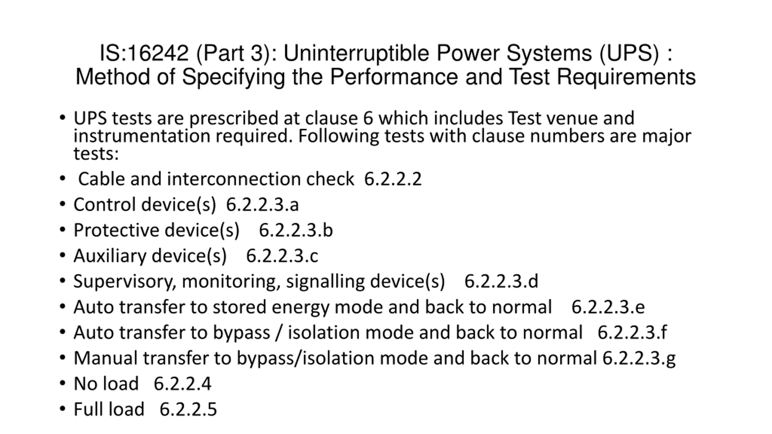 IS:16242 (Part 3): Uninterruptible Power Systems (UPS) : Method of Specifying the Performance and Test Requirements UPS tests are prescribed at clause 6 which includes Test venue and instrumentation required. Following tests with clause numbers are major tests: Cable and interconnection check 6.2.2.2 Control device(s) 6.2.2.3.a Protective device(s) 6.2.2.3.b Auxiliary device(s) 6.2.2.3.c Supervisory, monitoring, signalling device(s) 6.2.2.3.d Auto transfer to stored energy mode and back to normal 6.2.2.3.e Auto transfer to bypass / isolation mode and back to normal 6.2.2.3.f Manual transfer to bypass/isolation mode and back to normal 6.2.2.3.g No load 6.2.2.4 Full load 6.2.2.5
