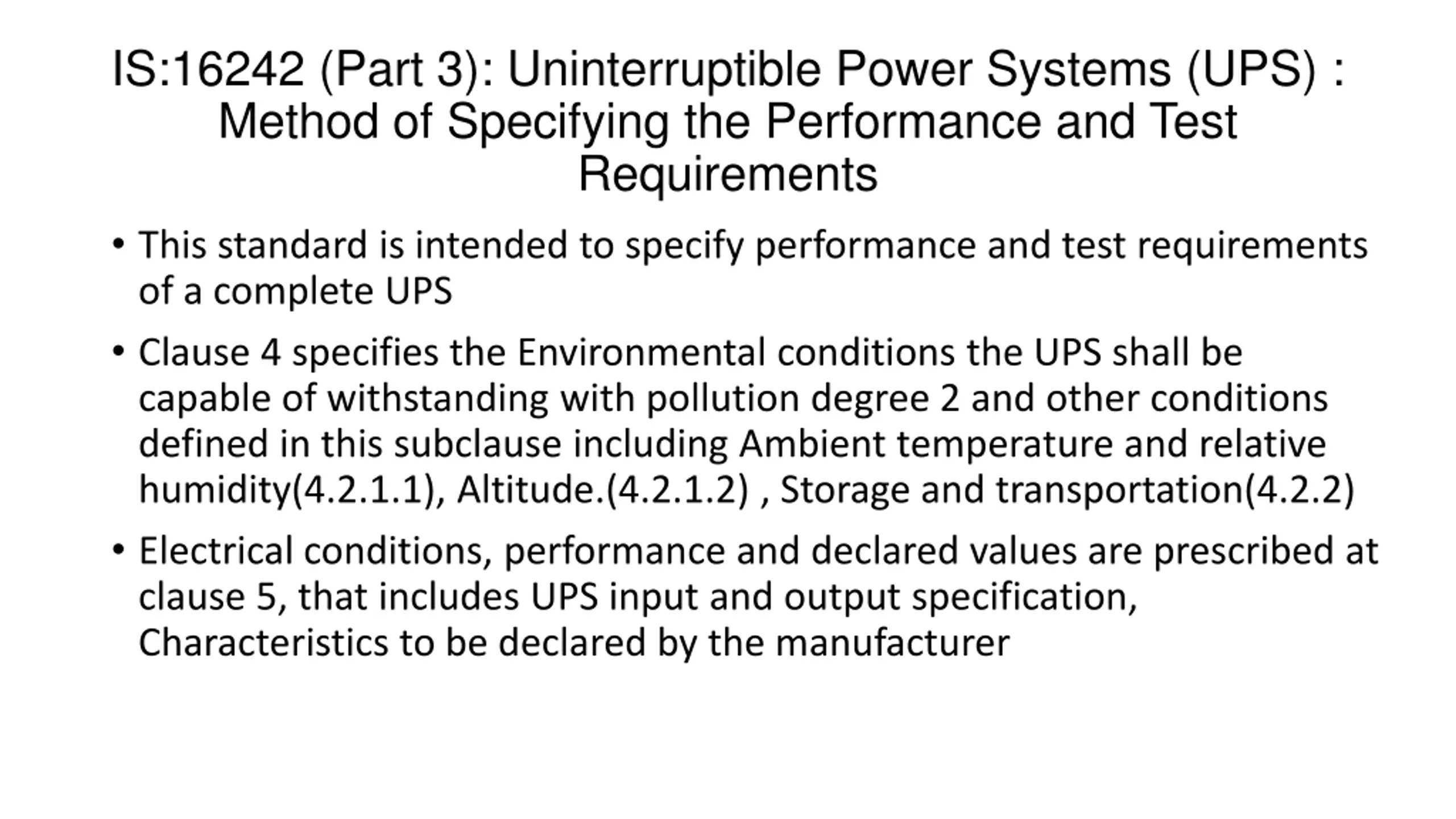 IS:16242 (Part 3): Uninterruptible Power Systems (UPS) : Method of Specifying the Performance and Test Requirements This standard is intended to specify performance and test requirements of a complete UPS Clause 4 specifies the Environmental conditions the UPS shall be capable of withstanding with pollution degree 2 and other conditions defined in this subclause including Ambient temperature and relative humidity(4.2.1.1), Altitude.(4.2.1.2) , Storage and transportation(4.2.2) Electrical conditions, performance and declared values are prescribed at clause 5, that includes UPS input and output specification, Characteristics to be declared by the manufacturer