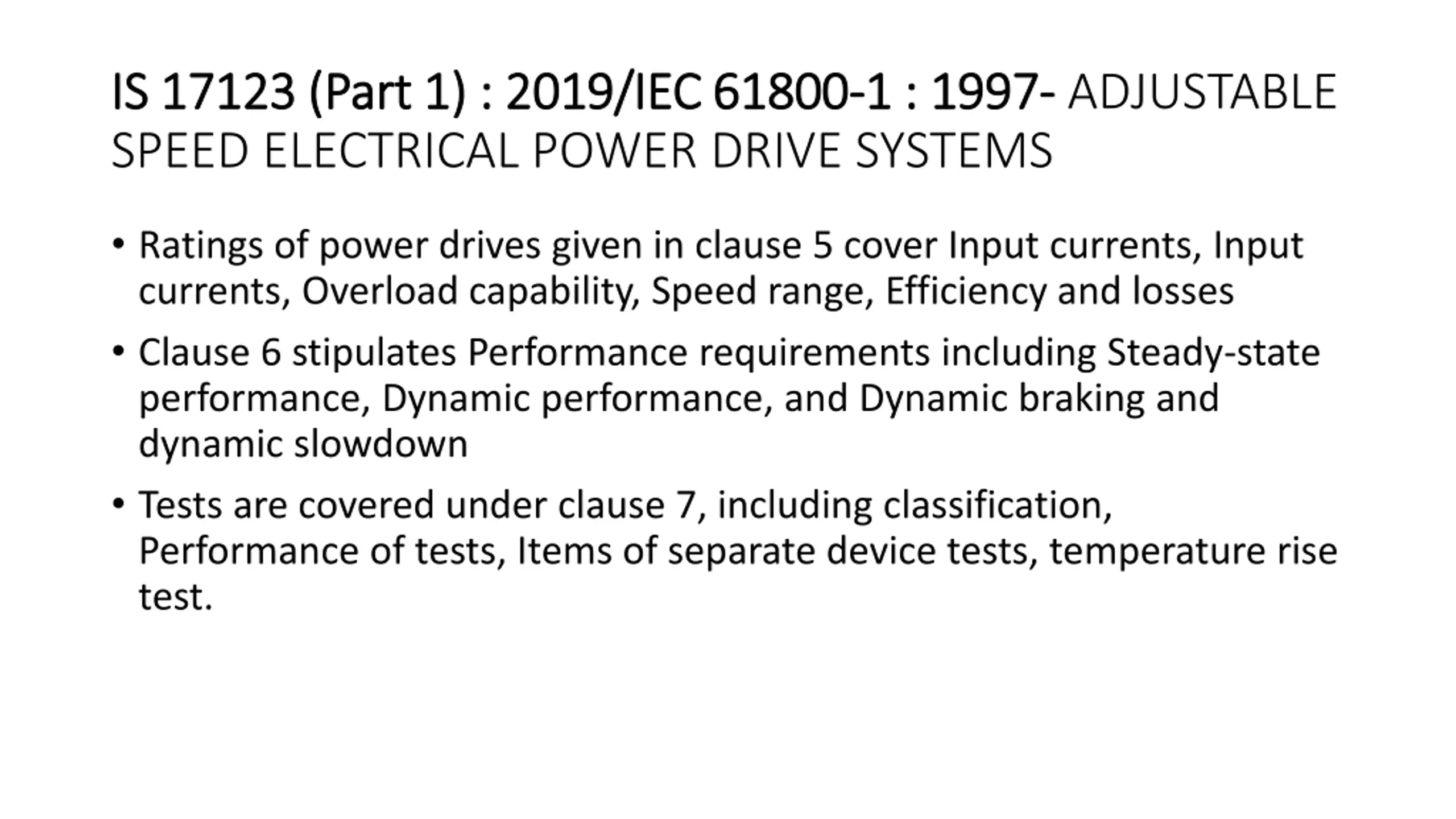 IS 17123 (Part 1) : 2019/ IS 17123 (Part 1) : 2019/IEC 61800 SPEED ELECTRICAL POWER DRIVE SYSTEMS IEC 61800- -1 : 1997 1 : 1997- - ADJUSTABLE Ratings of power drives given in clause 5 cover Input currents, Input currents, Overload capability, Speed range, Efficiency and losses Clause 6 stipulates Performance requirements including Steady-state performance, Dynamic performance, and Dynamic braking and dynamic slowdown Tests are covered under clause 7, including classification, Performance of tests, Items of separate device tests, temperature rise test.
