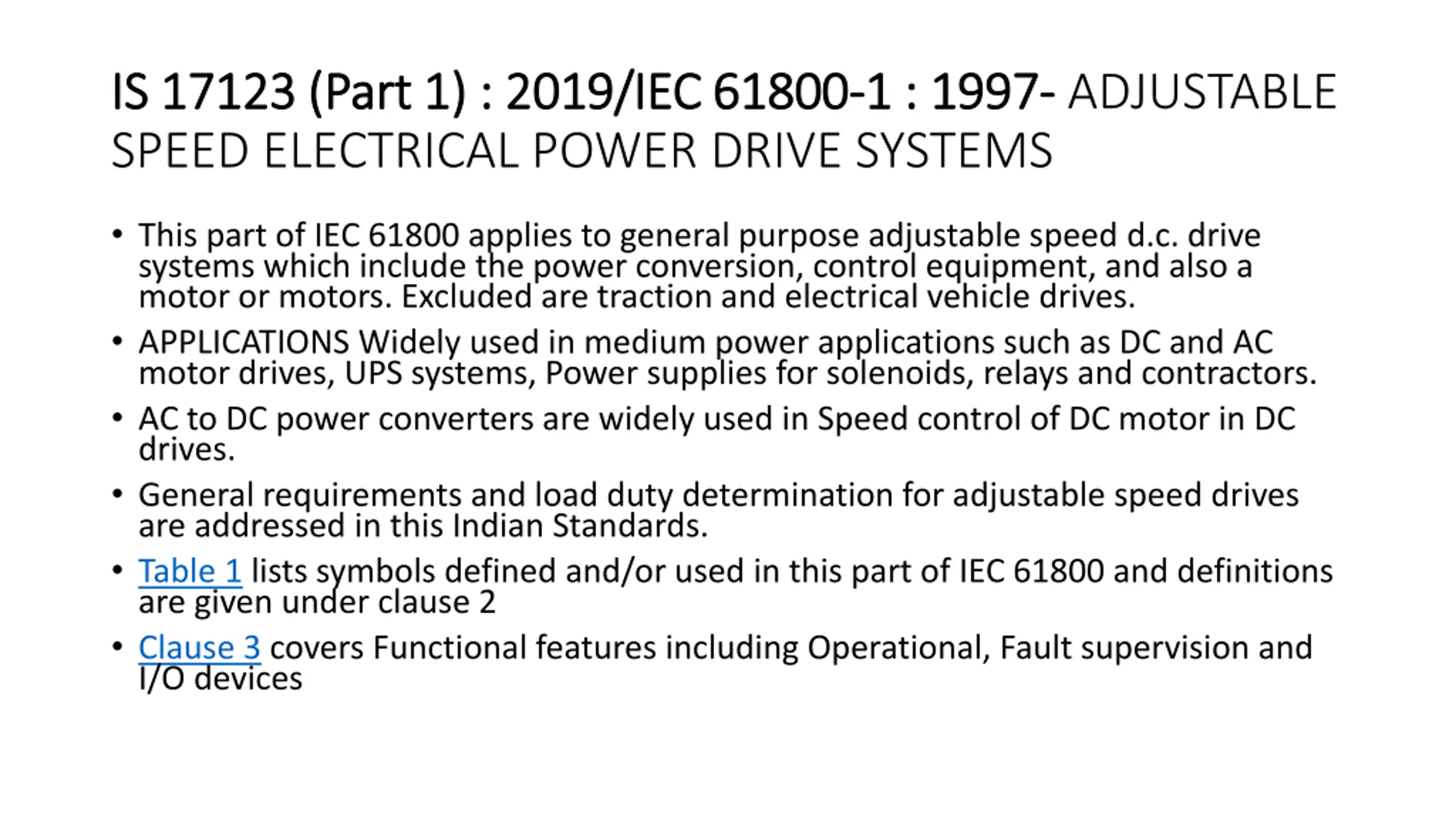 IS 17123 (Part 1) : 2019/ IS 17123 (Part 1) : 2019/IEC 61800 SPEED ELECTRICAL POWER DRIVE SYSTEMS IEC 61800- -1 : 1997 1 : 1997- - ADJUSTABLE This part of IEC 61800 applies to general purpose adjustable speed d.c. drive systems which include the power conversion, control equipment, and also a motor or motors. Excluded are traction and electrical vehicle drives. APPLICATIONS Widely used in medium power applications such as DC and AC motor drives, UPS systems, Power supplies for solenoids, relays and contractors. AC to DC power converters are widely used in Speed control of DC motor in DC drives. General requirements and load duty determination for adjustable speed drives are addressed in this Indian Standards. Table 1 lists symbols defined and/or used in this part of IEC 61800 and definitions are given under clause 2 Clause 3 covers Functional features including Operational, Fault supervision and I/O devices