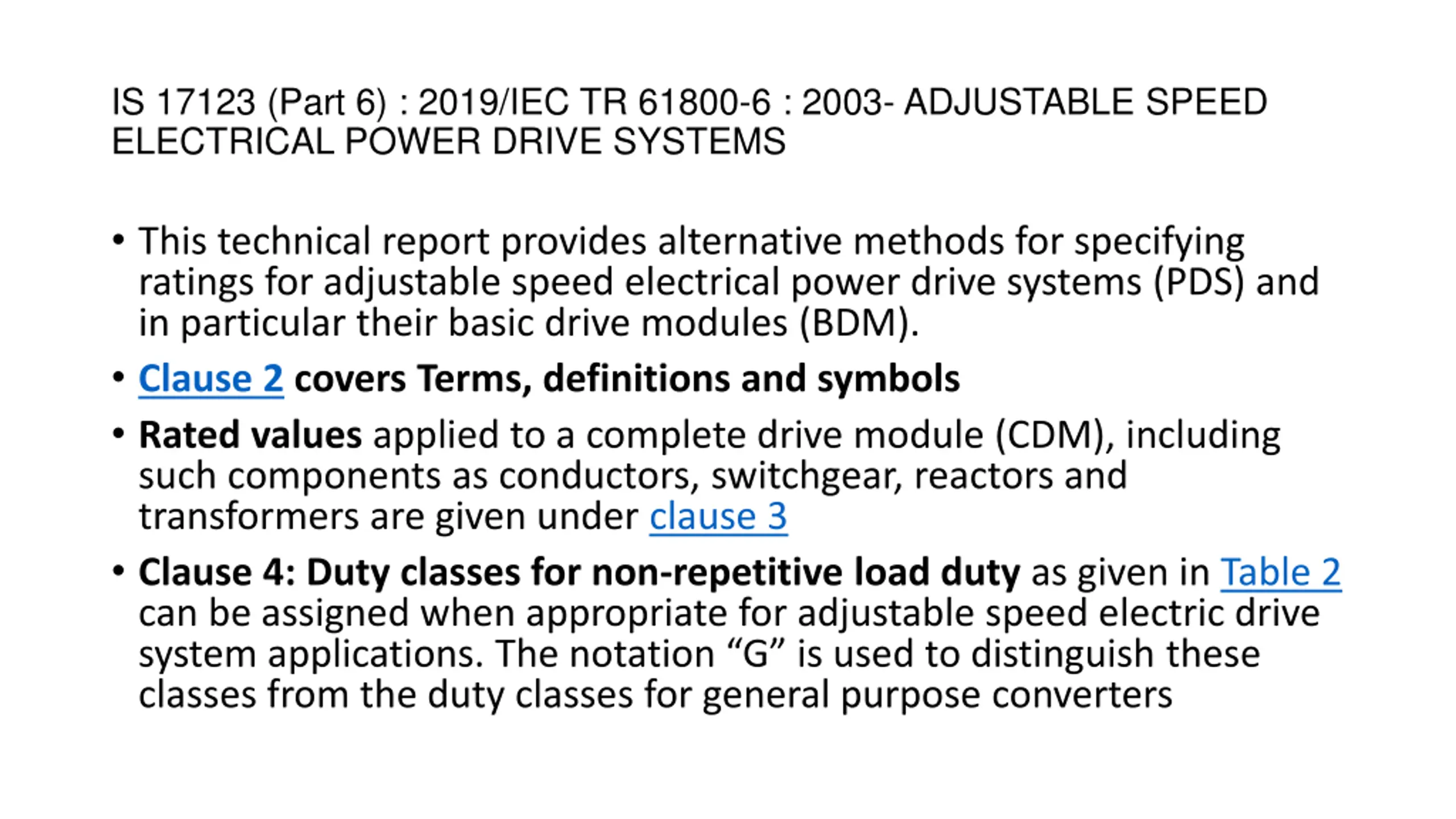 IS 17123 (Part 6) : 2019/IEC TR 61800-6 : 2003- ADJUSTABLE SPEED ELECTRICAL POWER DRIVE SYSTEMS This technical report provides alternative methods for specifying ratings for adjustable speed electrical power drive systems (PDS) and in particular their basic drive modules (BDM). Clause 2 covers Terms, definitions and symbols Rated values applied to a complete drive module (CDM), including such components as conductors, switchgear, reactors and transformers are given under clause 3 Clause 4: Duty classes for non-repetitive load duty as given in Table 2 can be assigned when appropriate for adjustable speed electric drive system applications. The notation G is used to distinguish these classes from the duty classes for general purpose converters