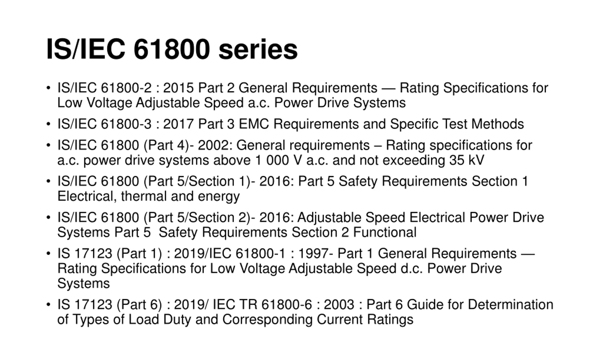 IS/IEC 61800 series IS/IEC 61800-2 : 2015 Part 2 General Requirements Rating Specifications for Low Voltage Adjustable Speed a.c. Power Drive Systems IS/IEC 61800-3 : 2017 Part 3 EMC Requirements and Specific Test Methods IS/IEC 61800 (Part 4)- 2002: General requirements Rating specifications for a.c. power drive systems above 1 000 V a.c. and not exceeding 35 kV IS/IEC 61800 (Part 5/Section 1)- 2016: Part 5 Safety Requirements Section 1 Electrical, thermal and energy IS/IEC 61800 (Part 5/Section 2)- 2016: Adjustable Speed Electrical Power Drive Systems Part 5 Safety Requirements Section 2 Functional IS 17123 (Part 1) : 2019/IEC 61800-1 : 1997- Part 1 General Requirements Rating Specifications for Low Voltage Adjustable Speed d.c. Power Drive Systems IS 17123 (Part 6) : 2019/ IEC TR 61800-6 : 2003 : Part 6 Guide for Determination of Types of Load Duty and Corresponding Current Ratings